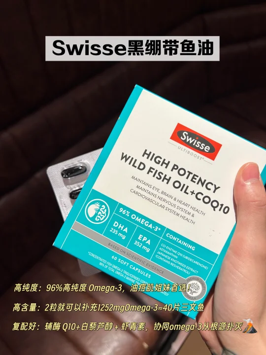 像我现在在吃的就是这个Swisse黑绷带鱼油,这是集高纯度&高含量于一体的“灭🌋器”!每两粒就含有1252mg 96%高纯度Omega-3,相当于40片三文鱼,高效补充,直接拿捏体内🌋🌋!不仅如此,里面还含有的辅酶Q10、白藜芦醇、虾青素,这三个复配成分形成了一个像三角形一样稳固的K🌋盾,协同Omega-3从根源扑灭🌋🌋后防止复燃,攻防兼备,真正做到了1+3>4的效果!