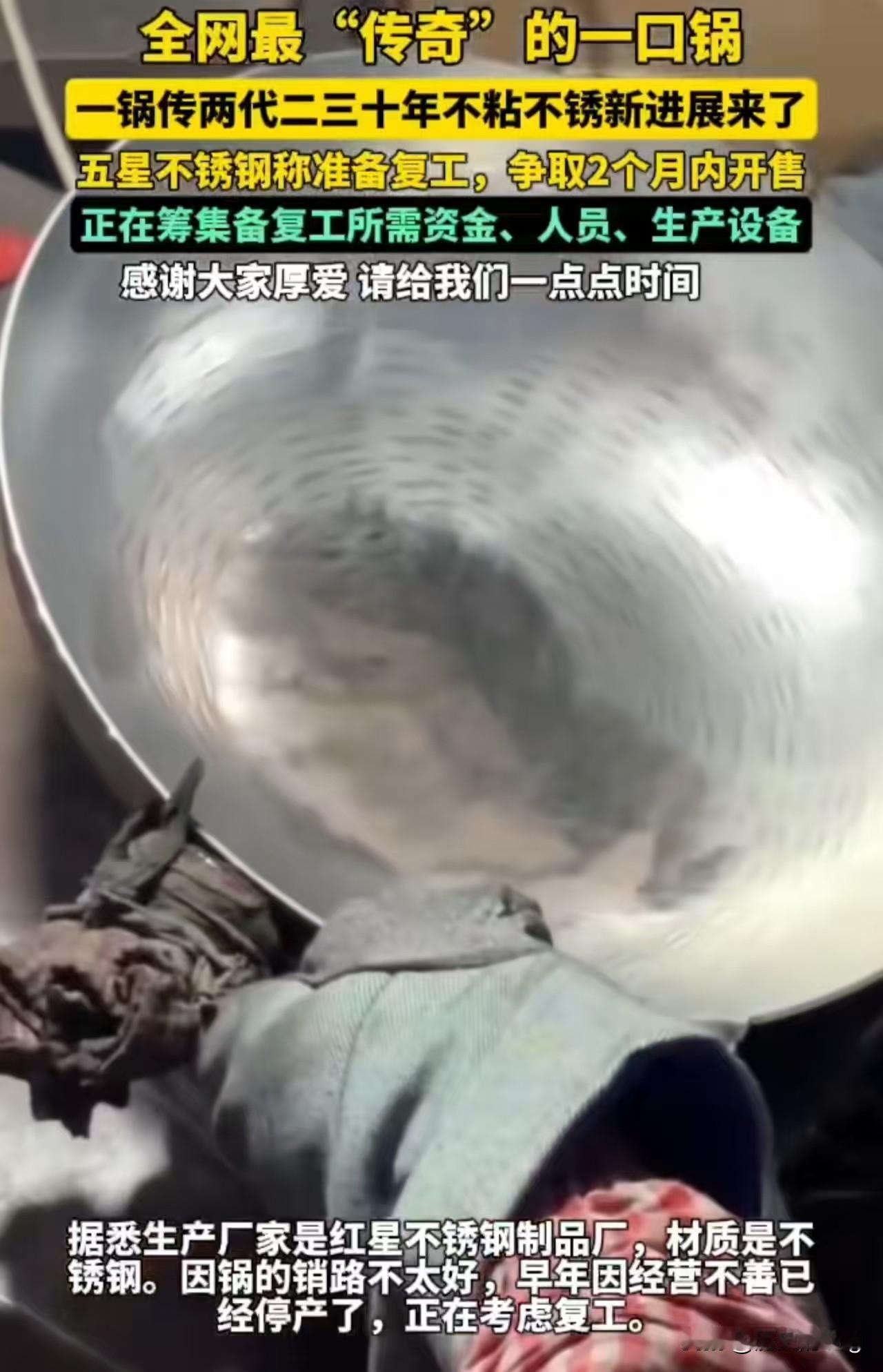 “一锅传两代,人走锅还在!”近日,一位网友发布视频称,自家的一口五星不锈钢锅已经使用了20多年了,不仅没有破洞,而且也没有生锈。于是她在网上寻找这口锅的生产厂家,想知道他们还在不在,但是至今还未得到真正的厂家的回复。 不过网上有类似的厂家站出来回应,说是因为锅的销路不好,老早就停产了。现在了解到大家的呼声这么高,正在准备复工生产,希望大家给他们一点时间。确实,如果真能用20多年还不粘不锈的话,那真是大家心目中的一口好锅了。 个人感觉这口锅复工生产的可能性不是很大,一是因为年代过于久远,制锅工艺可能已经存在落后;二是其他的厂家也要生存下去,你一口锅就能用二三十年,那其他人岂不是要喝西北风去了。 对此,你怎么看呢?
