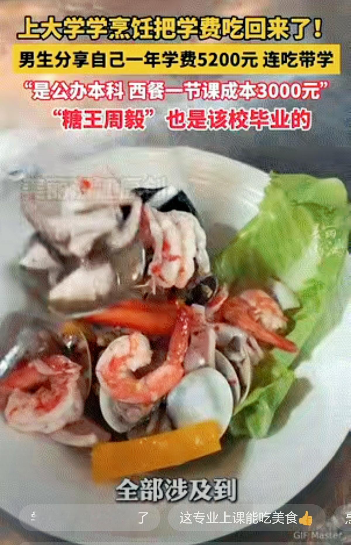 看完四川男生的专业,我肠子都悔青了!这才是把大学读“赚”了! 后悔死了!四川一个男生学的烹饪专业,说自己一年学费5200,结果上课连吃带学,单一节西餐课成本就3000,早把学费吃回本了,这大学上得也太值了! 这男生本身就爱吃,梦想当美食家,高考填志愿直接选了烹饪,关键这还是学校的王牌本科专业,录取分可不低。选了自己喜欢的专业,他学得特带劲,上课做的菜最后都能自己吃,练了手艺还省了饭钱,简直一举两得。 估计这专业没人会逃课吧?毕竟逃课就亏了一顿美食!其实选专业真不用盲目追热门,像这样贴合兴趣又实用的,既能做喜欢的事,还能掌握安身立命的本事,才是真明智。 你当年填志愿选对专业了吗?如果有这样的烹饪专业,你会报名吗?来评论区说说~