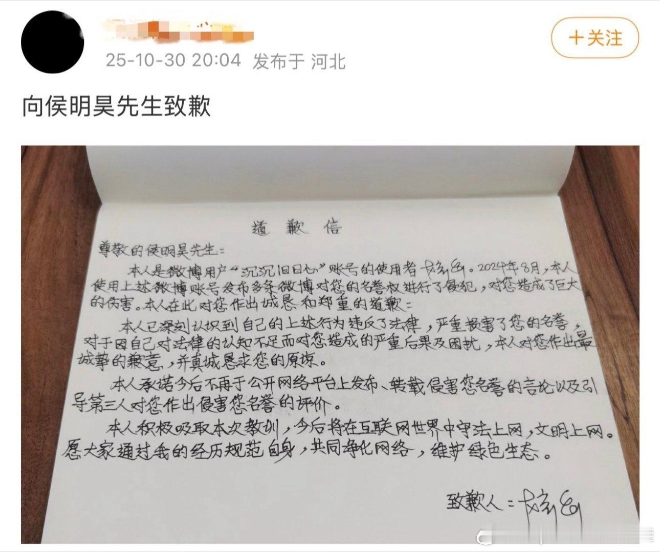 侯明昊方发布告黑维权进度黑粉手写道歉信加支付赔偿,互联网非法外之地,支持维权!