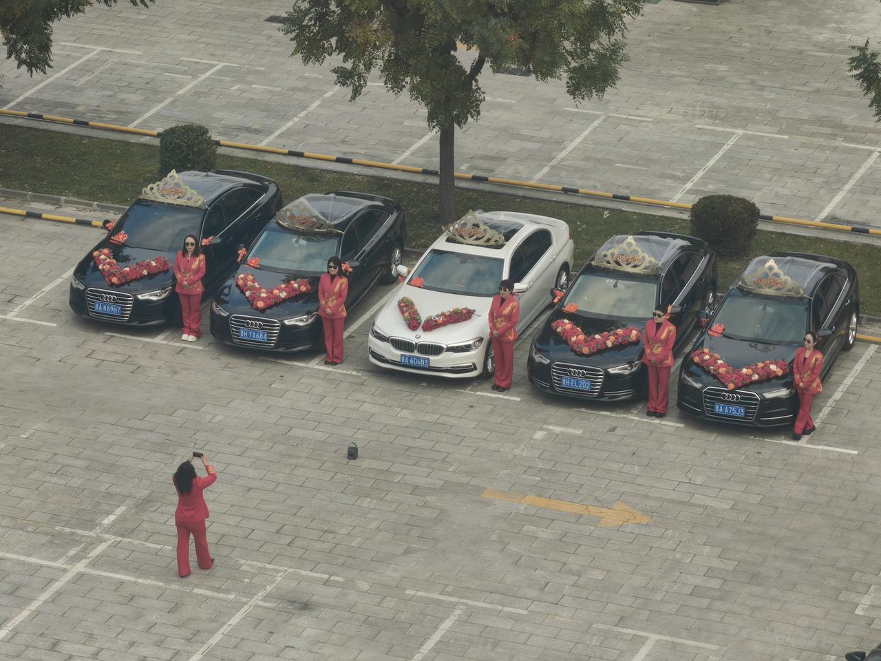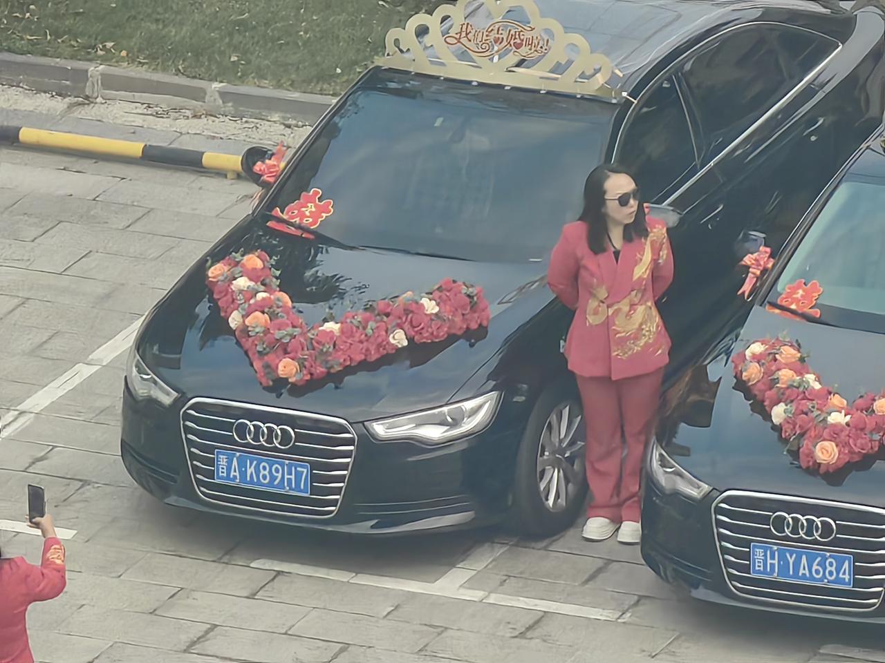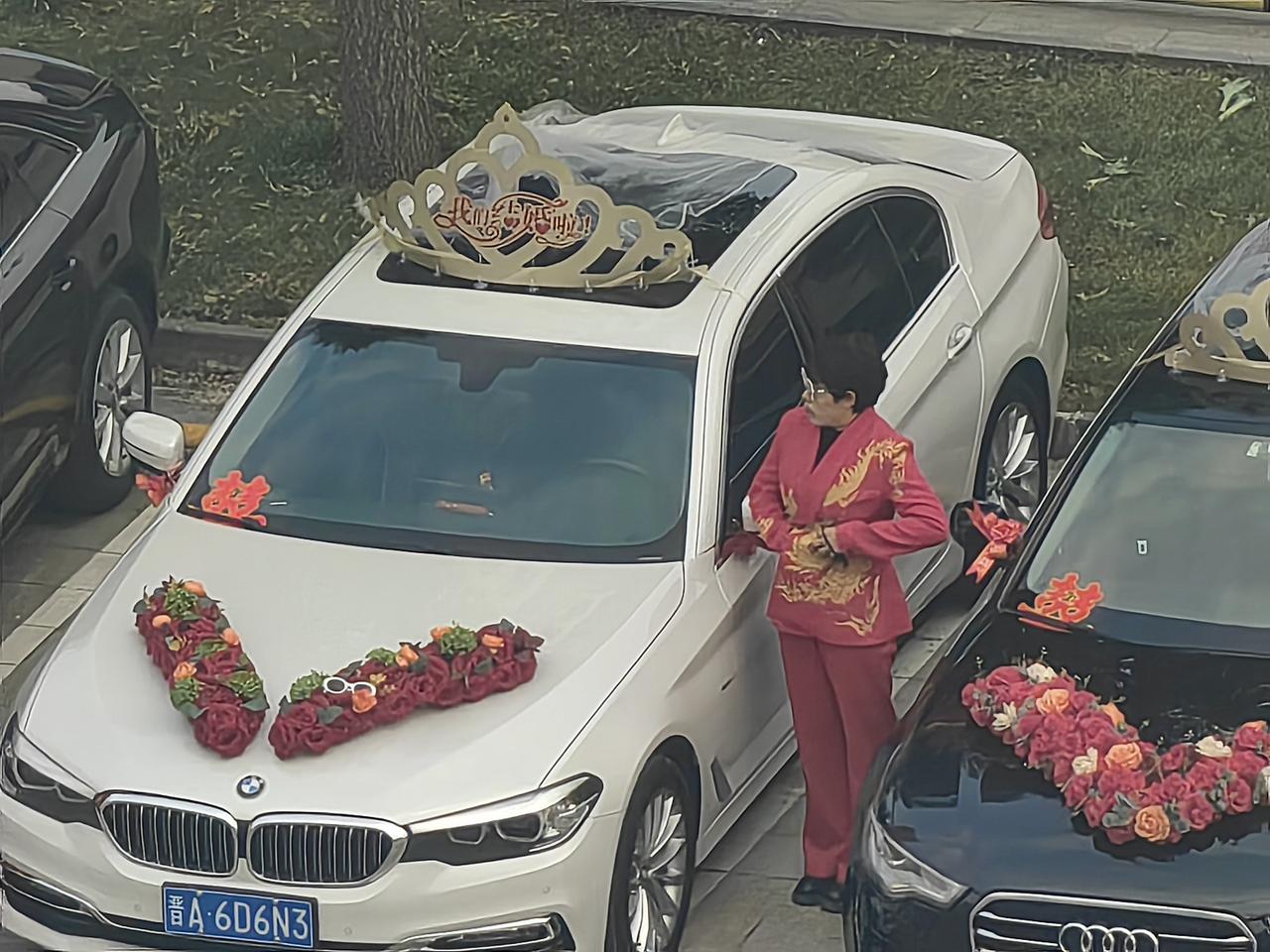 在山西原平某酒店偶遇娶亲的礼仪车队,披红戴花,那场面太喜庆了。礼仪小姐们站的整齐,恭候大驾,车辆擦的很亮。原平婚车队可是有独特风格的,好多都用捷豹豪车领衔,宝马奔驰臭迪迪常见,彰显活力。 原平婚俗文化丰富,车队把传统和现代审美结合,让人感受到了浓浓的喜庆氛围。 婚礼迎亲仪式 喜庆的迎亲队