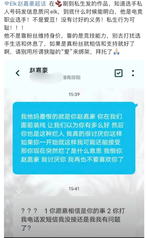 直播吧10月31日讯近日BLG深陷商K事件舆论,ELK更博自证清白,今日ELK超话粉丝发布,疑似Elk粉丝晒和Elk短信记录:你说我愿意相信是我的事,那好吧,对不起。