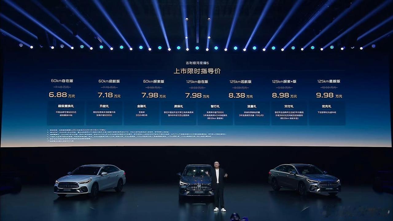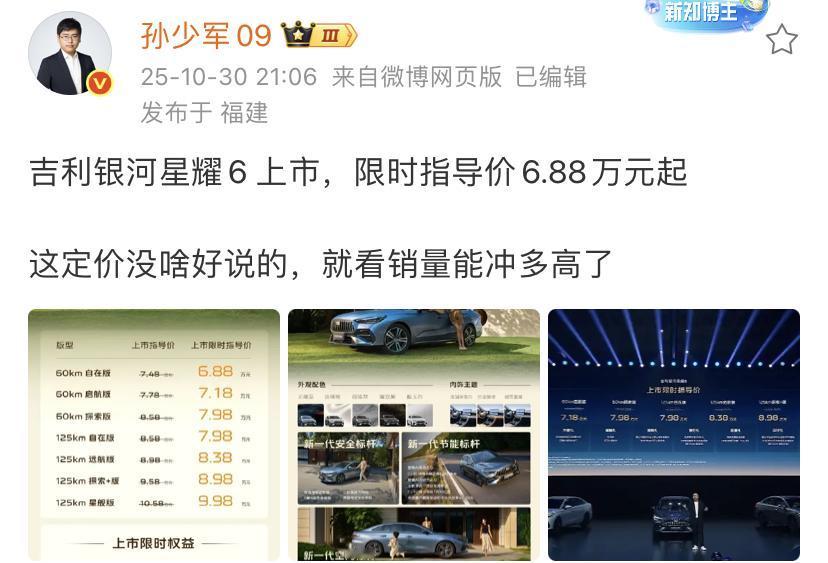 孙少军:吉利银河星耀6上市,限时指导价6.88万元起! 这定价没啥好说的,就看