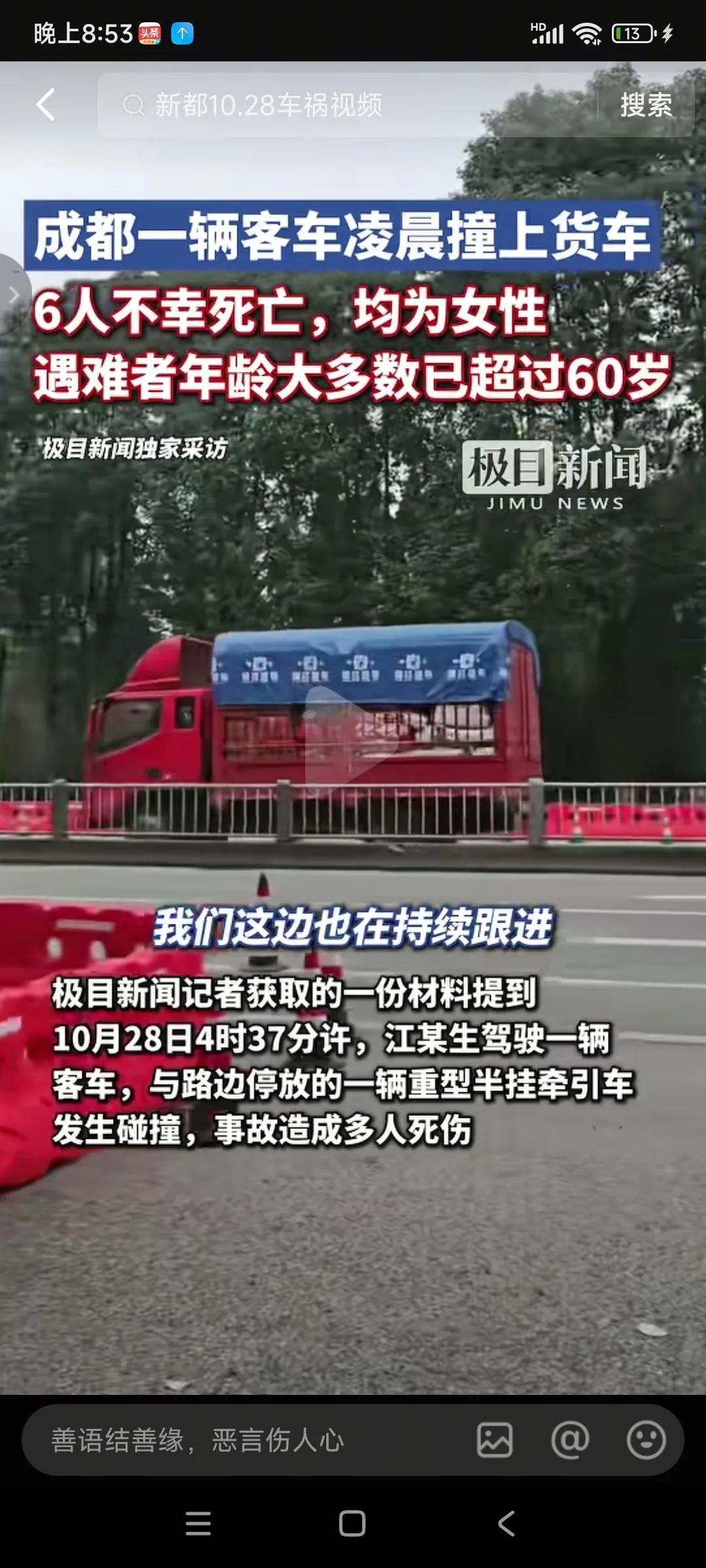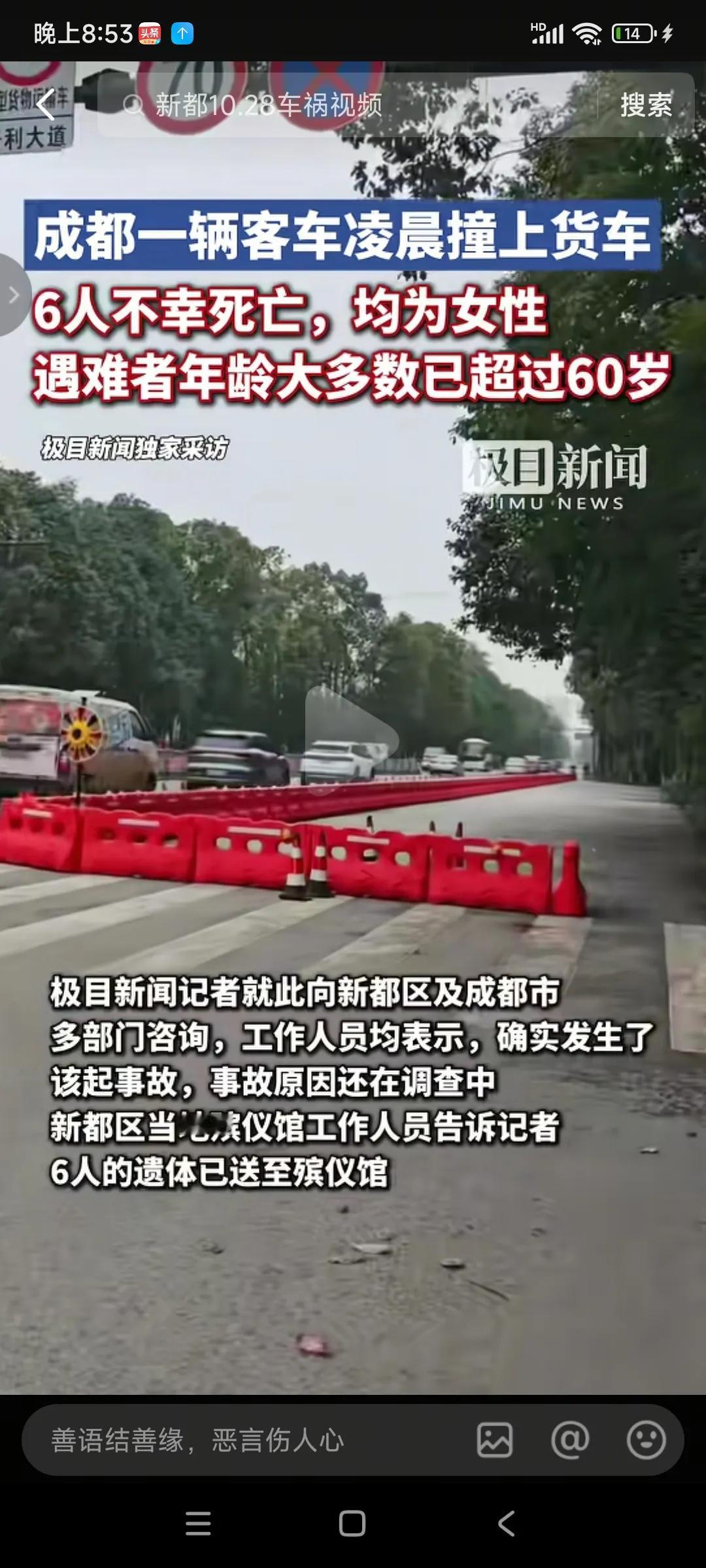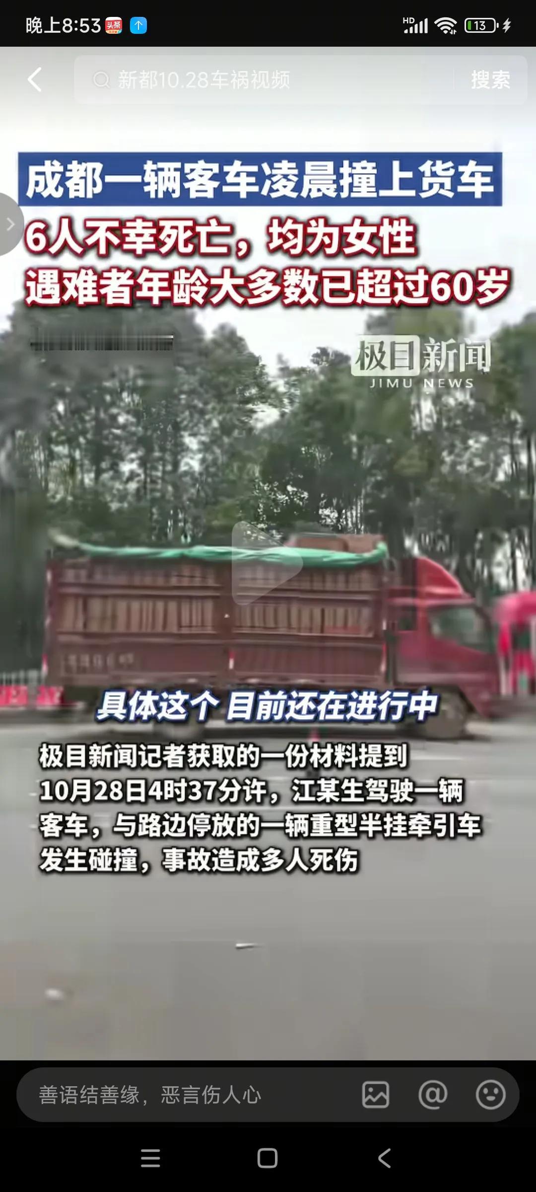 成都一辆面包车撞上货车,造成6死5伤。据悉,面包车载有公路绿化养护人员,他们凌晨3点多完工后返程,车辆核载7人,实载11人,撞上了停在路边的重车。该绿化养护工程经过多次转包。 开车需注意安全,生命并非儿戏。6人意外离世令人痛心,出门务必将安全放在首位,愿所有人出行平安顺利。 网友评论: 都是穷苦老百姓,60多岁了还出去干活,工资低的可怜。 如果是真的转包,这个问题就可以好好查一下了,看一包二包三包转包的是什么人,重点查一下招投标程序。 他是怎么开车的, 本来就超载了 ,而且又是凌晨四点多 ,应该打起12分精神。 这种情况很多的,我在海南,这里很多这种面包车拉阿姨们出去做工的,一车十七八个但二十二三个不等。 晚上视线不好,必须整治乱停乱放。晚上开车要小心,马路上到处有车乱停乱放。 所以说安全驾驶不是儿戏,更何况还载这么多人,驾驶不分心,安全当谨记! 周边做绿化的基本都是这样,严重超员,有些甚至做小货车货箱里面。