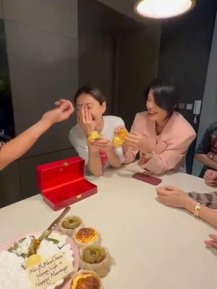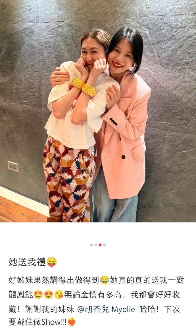 胡定欣晒出好姐妹胡杏儿赠送的一对纯金龙凤镯,胡定欣望着金镯子笑的合不拢嘴并配文:“好姐妹果然讲得出做得到!无论金价多高都会好好收藏,下次要戴住做SHOW(戴着表演)!”据悉,胡定欣2024年底承认恋情,港媒曾曝对方叫陈健华(Akin),是一名外科医生。今年10月6日,胡定欣晒结婚照官宣结婚。