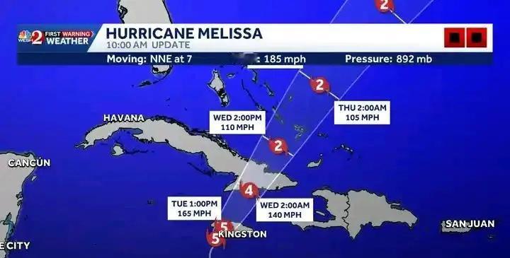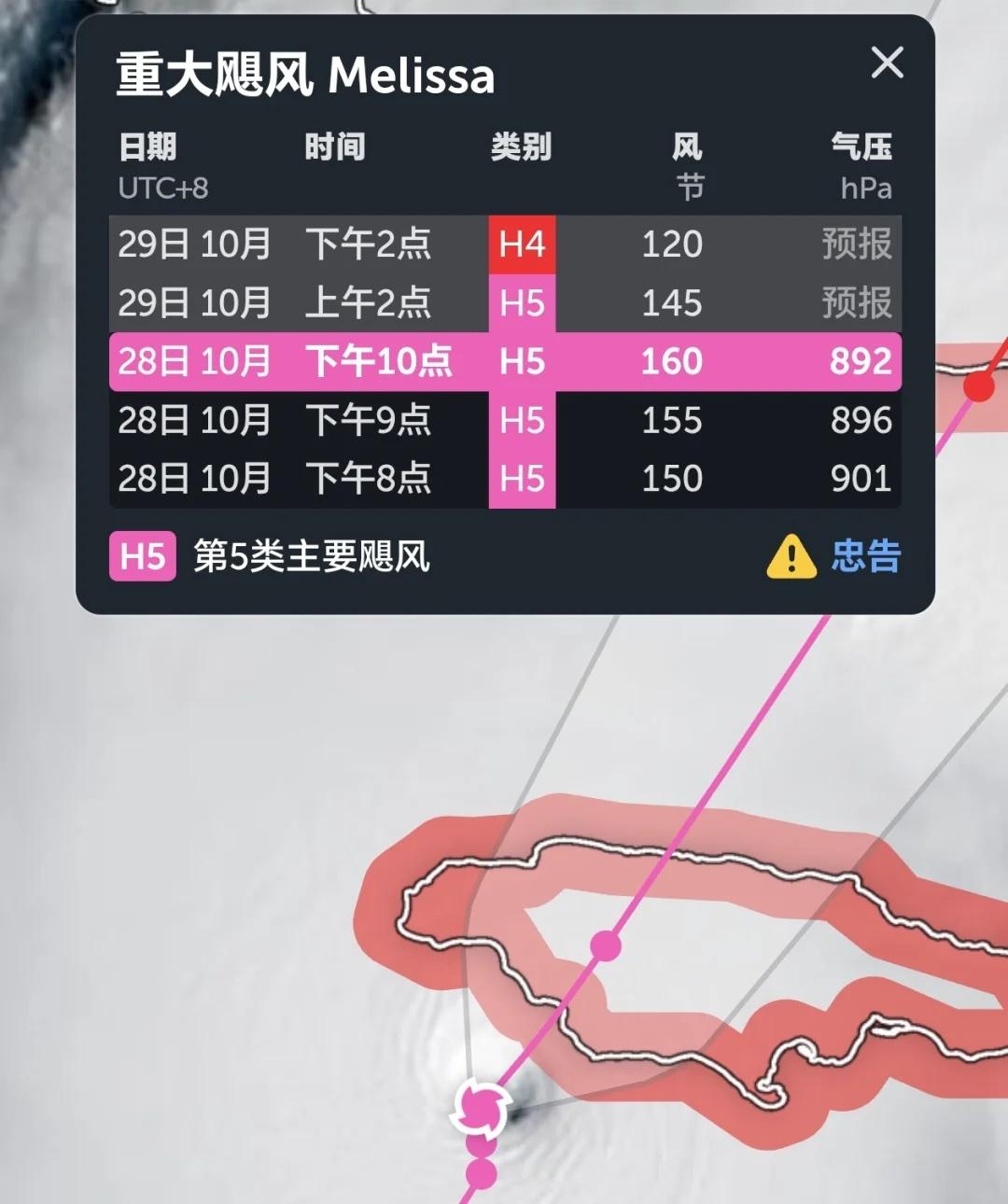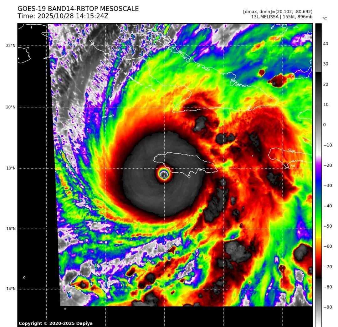 【160kt!飓风“梅莉莎”终于!】 北京时间22时,UTC14z,美国国家飓风中心NHC将“梅莉莎”的强度最终升格到了160kt,顶级5级飓风强度,已经成为西半球历史最强热带气旋之一。 “梅莉莎”即将于2-3小时后登陆牙买加,登陆地预计在“布莱克里弗”附近。牙买加目前已经出现大范围设施破坏、失联、停电的情况。这是有史以来当地最强风暴,称得上是灭顶之灾。 气象 飓风 飓风梅丽莎