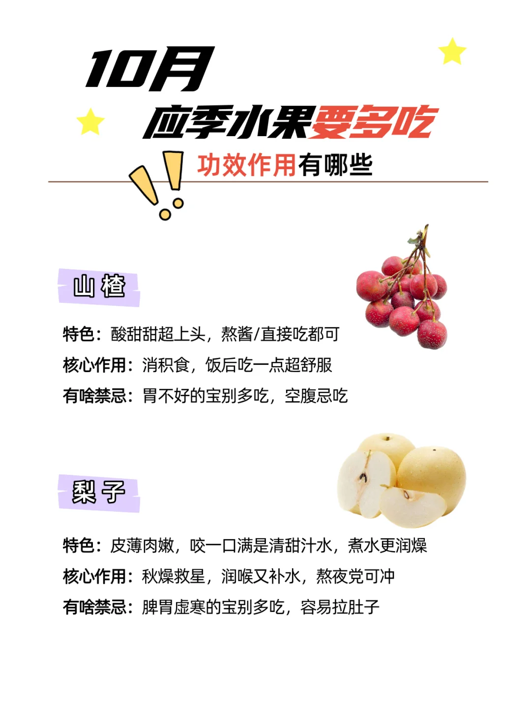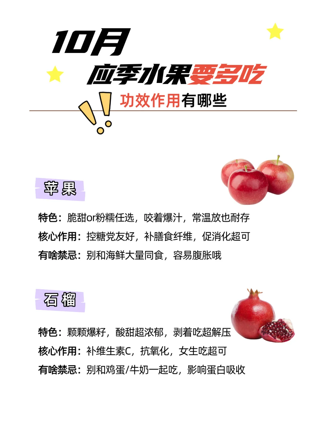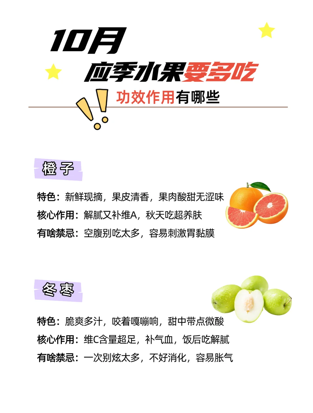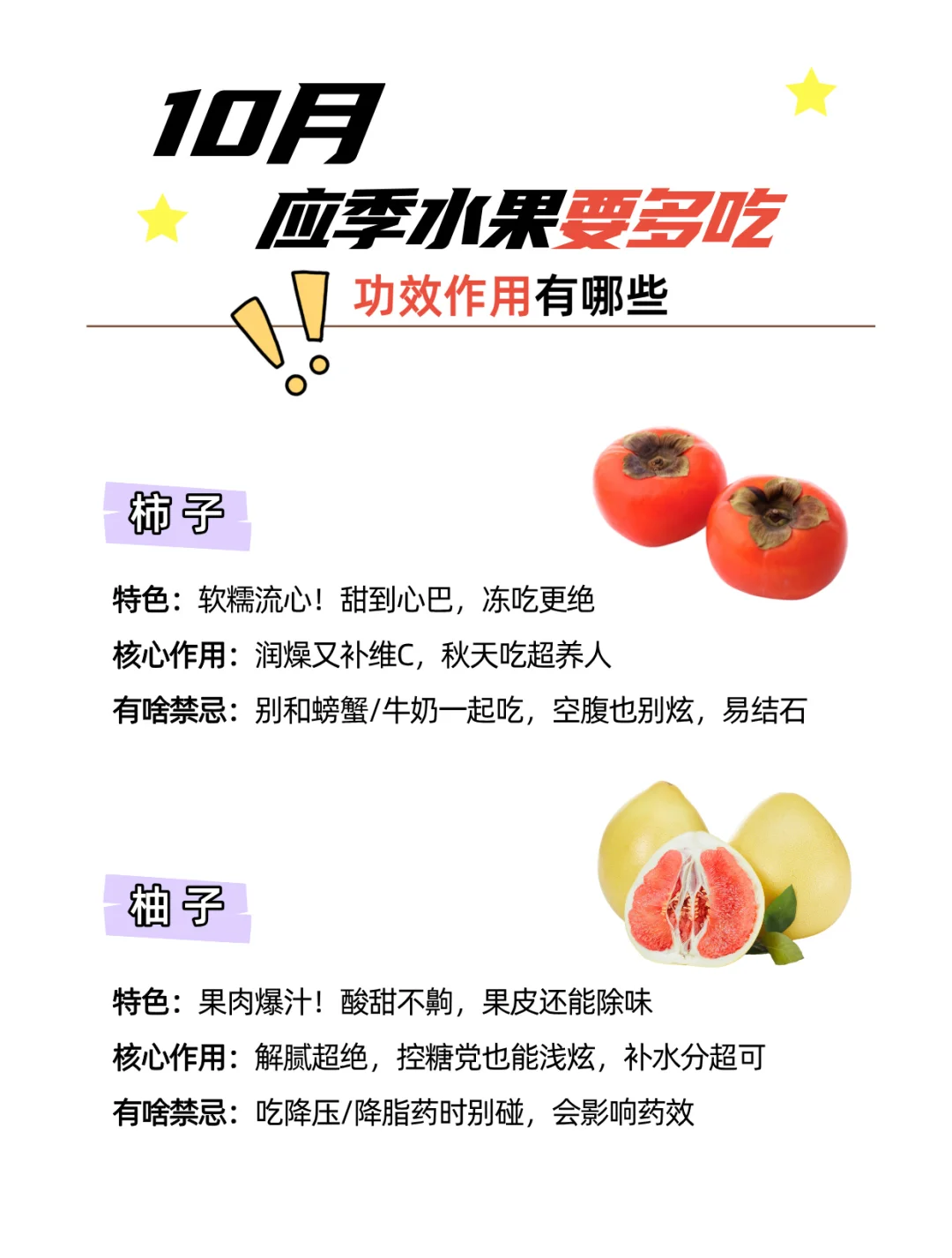 宝子们!10月必存的应季水果攻略来啦~ 足足10种当季鲜货,从爆汁柚子、润喉梨,到脆甜冬枣、流心柿子,每款都有口感特色、养身功效,连避坑禁忌都列好! 选果小贴士也安排了,教你挑新鲜款,秋天吃对果既能润燥又不踩雷,快翻翻找找你最爱的那款~