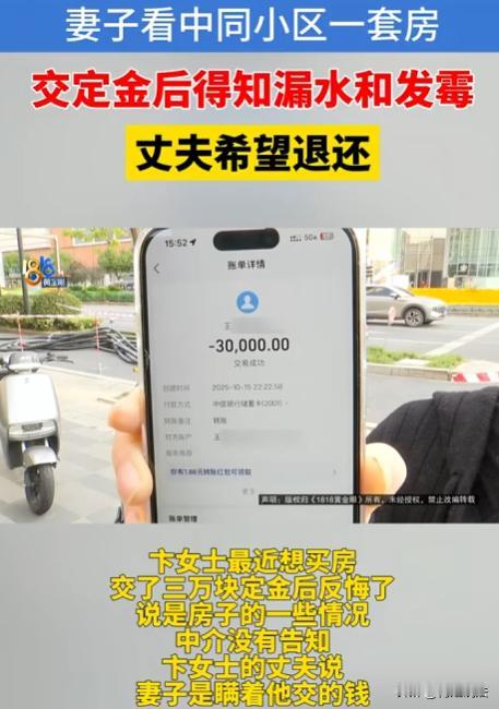 浙江杭州,一女子瞒着丈夫交了3万定金买下价值170万的二手房,交完定金后才发现房屋内部有裂纹,还严重漏水,女子后悔想退定金,又怕丈夫知道生气,便联系记者帮忙。中介称已签合同,定金无法退还。 卞某婚后和公公婆婆挤在老房子里,虽说老人能帮忙照看孩子,可日子久了,她总觉得浑身不自在。每天进进出出,连说点私房话都不方便,心里一直憋着股劲,想搬出去住。 她跟丈夫提了好几次买新房的事,可丈夫觉得现在家里经济压力大,老人住着也习惯了,没必要再折腾。为此,两人没少吵架,卞某甚至拿离婚来威胁丈夫,丈夫被闹得没办法,只能暂时松口同意。 得到丈夫的应允,卞某立马开始看房。她心里着急,就想快点找个合适的房子搬出去。在中介的介绍下,她看中了一套二手房。这房子在一楼,还带个小院子,面积有101平,价格在171万左右。 中介一个劲地夸这房子好,还说价格特别划算,比周边同类型的房子便宜不少。卞某听了心里痒痒,也没仔细多看看,脑子一热,当场就交了3万定金,还签了购房协议。 交完定金,卞某心里踏实了些,想着终于要有自己的新家了。可等她再次来到房子里,仔细检查的时候,才发现问题大了。房子内部墙壁上有好几道裂纹,像是被什么东西狠狠砸过一样。 更糟糕的是,房子还严重渗水。她走进房间,一股霉味扑面而来,地上湿漉漉的,墙角的外墙也有多处破损,雨水顺着裂缝渗进来,把墙皮都泡得脱落了。卞某看着这房子,心里直犯嘀咕,这哪能住人。 她越想越后悔,觉得自己太冲动了,没把房子看清楚就交了定金。现在她不想买这房子了,可定金已经交了,合同也签了,这可怎么办才好。她怕丈夫知道后会生气,毕竟这3万定金也不是个小数目。 卞某想来想去,决定先找房东退定金。她找到房东,跟房东说自己发现房子有这么多问题,不想买了,希望房东能把定金退给她。 房东一听,说房子的情况早就给她看过了,是她自己当时没仔细看,现在反悔,哪有这个道理。 卞某见房东不肯退,又降低了要求,说那就退2万吧。她觉得这样自己也能少损失点。可房东还是不答应,说合同都签了,定金不能退。卞某没办法,只好回家跟丈夫商量。 丈夫知道后,虽然也埋怨她太冲动,但还是心疼那3万块钱。他想了想,觉得要不就跟房东再商量商量,退一半也行。 于是,卞某又联系房东,说退1.5万。可房东还是不同意,态度很坚决。 卞某这下彻底没辙了,她觉得自己太倒霉了,本来想买个新房改善生活,结果却落得这么个下场。 她联系了记者,希望记者能帮她解决这个问题。记者了解情况后,联系了中介。 中介表示,他们没有隐瞒房子的问题,在介绍房子的时候,已经把房子的基本情况都告诉卞某了。 而且合同也签了,按照合同约定,定金是无法退还的。卞某听后,也不知道该怎么办。 最终,因为卞某自身原因不想买房,按照合约规定,房东拒绝退还3万定金。卞某只能自认倒霉,她后悔自己当初太冲动,没有仔细考虑清楚就交了定金。 有人认为,在此事件中,卞某作为购房者,在签订购房合同前有义务对房屋状况进行充分了解,若因自身疏忽未发现房屋问题,在合同已签订后,在没有证据证明中介或房东存在欺诈时,要求退还定金,可能没有法律依据。 但从另一个角度看,若卞某能证明中介在介绍房屋时,存在故意隐瞒房屋的质量问题,误导签订合同。 @梅姐说法 法律分析: 那么,卞某是否可以依据消费者权益保护法,要求中介承担相应赔偿责任,甚至解除合同并退还定金呢? 从合同层面看,卞某与房东签订购房协议并交付定金,合同一旦成立,双方都应受其约束。 根据《民法典》第五百八十七条,给付定金的一方不履行债务或者履行债务不符合约定,致使不能实现合同目的的,无权请求返还定金。 卞某因自身原因不想买房,属于不履行债务,房东拒绝退还3万定金,符合法律规定。 卞某主张退定金,关键在于能否证明中介或房东存在过错。 若卞某能证明中介故意隐瞒房屋重大质量问题,误导其签订合同,依据《消费者权益保护法》第八条,消费者享有知悉其购买商品真实情况的权利。 中介作为房屋销售方,有义务如实告知房屋状况。若故意隐瞒,就侵犯了卞某的知情权。 根据《民法典》第586条,定金是担保合同履行的,给付定金的一方不履行债务,无权要求返还定金。 卞某发现房屋有裂纹、漏水等问题后不想买了,这属于她单方面不想履行合同,正常情况下,按照这个条款,她确实无权要求房东退还定金。 因为她交定金时合同已经成立,她有义务按照合同约定买下房子,可她因为房屋质量问题反悔,就违反了合同约定。 卞某没有足够证据证明中介存在故意隐瞒行为,所以,难以依据法律主张退定金。 信息来源:1818黄金眼