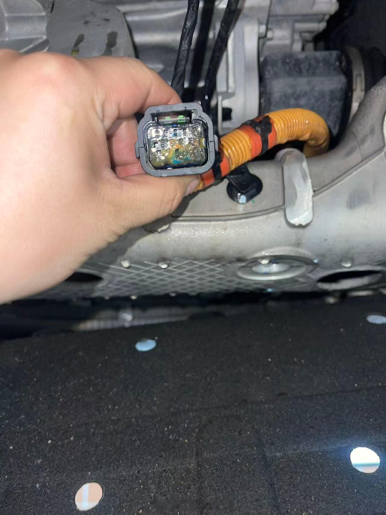 照片显示:该电气插头金属触点位置严重腐蚀,也不知道是什么车,也不知道什么原因引起的。