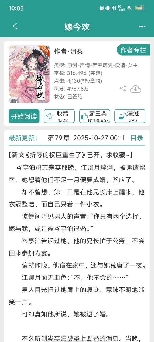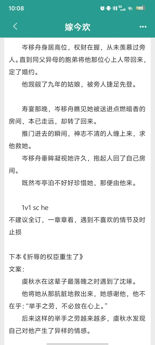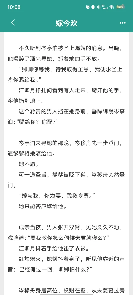 《嫁今欢》by洱梨 已经完结的文,一共83章 婚前装谦谦君子,婚后索求无度。 爹系伪君子在女主面前装模作样,看似克制疏远,实则早就觊觎女主,步步谋划让女主看清未婚夫真面目,果断把女主抢回来 女主一直都比较怕男主,后来发现他其实已经喜欢自己多年,逐渐打开心扉接纳他。