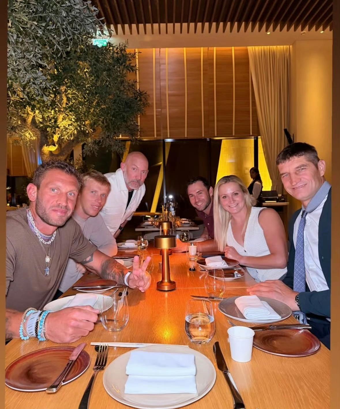 萨巴伦卡分享自己和团队在WTA年终总决赛晚宴的照片。感觉这次她夺冠希望很大。 男朋友是每站必在的,还有陪练、体能师,这三人在图一的左边。 图一的右边从前往后分别是助教米尔尼、理疗师、教练。