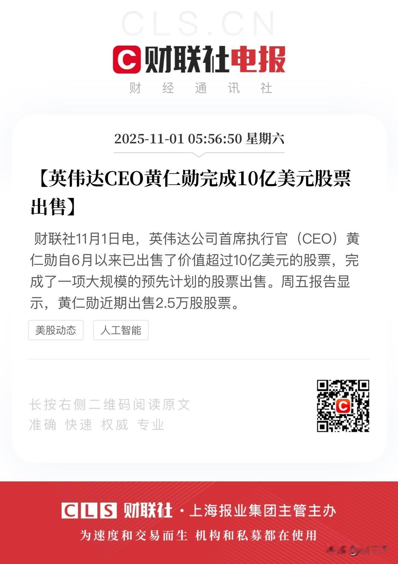 黄仁勋抛售英伟达股票喜得10亿美元! 接下来黄仁勋的路子和苹果库克差不多了, 跑