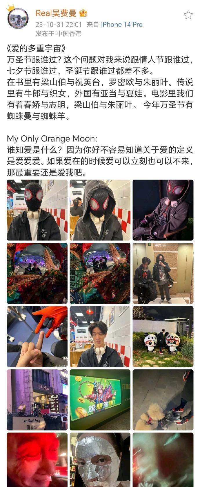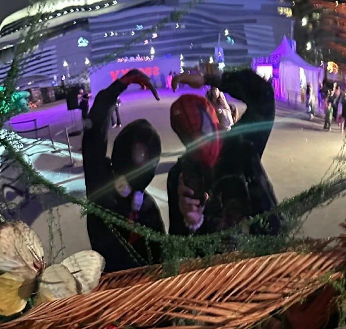 吴镇宇儿子费曼晒与杨阳洋万圣节聚会,幽默配文:今年万圣节有蜘蛛曼与蜘蛛羊。两人均戴着蜘蛛侠面罩,并默契地比心合照。