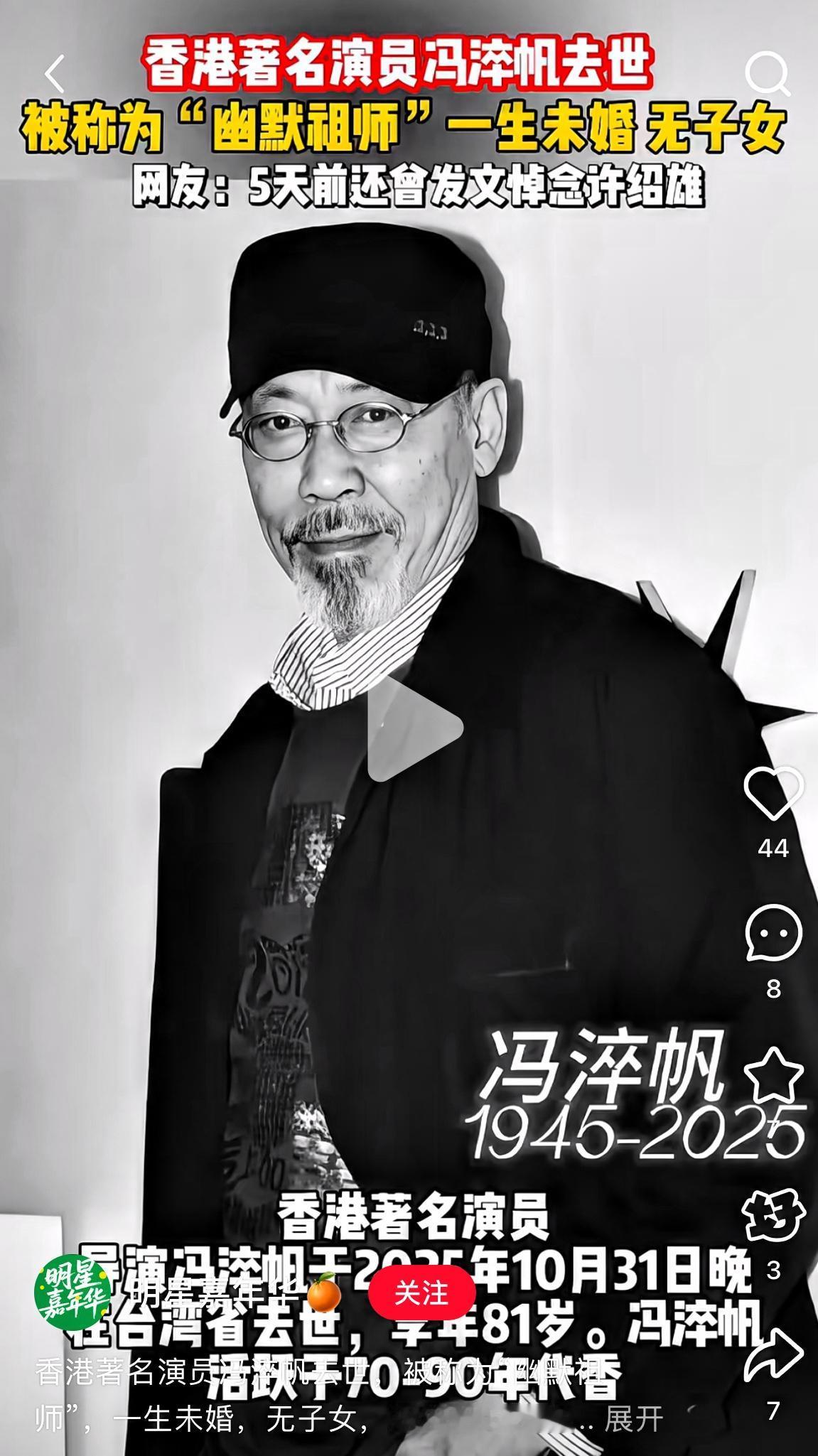 一语成谶!香港老戏骨冯淬帆去世,三天前他刚给好友许绍雄写下:贤弟等我,愚兄随后来… 谁能想到一句悼念会成生死约定?香港老戏骨冯淬帆三天前还在社交平台给离世好友许绍雄留言“贤弟等我,愚兄随后来”,当时大家只当是老友间的痛心话,没成想这竟成了他留给世界的最后一句话。 三天啊,不过短短七十二小时,那个曾给我们带来无数欢笑的“冷面笑匠”就真的追着好友去了。其实早阵子冯淬帆就说过自己“病入膏肓,苟延残喘”,想来对他而言,这不是意外的一语成谶,更像是解脱,是去赴一场早盼着的重逢。 我们总以为熟悉的演员会一直在,可看着冯淬帆、许绍雄这样的老戏骨接连离开,才突然发觉,属于我们的那个港片黄金时代,正一点点随着他们落幕。那些刻在记忆里的经典角色,以后只能在旧影片里回味了。