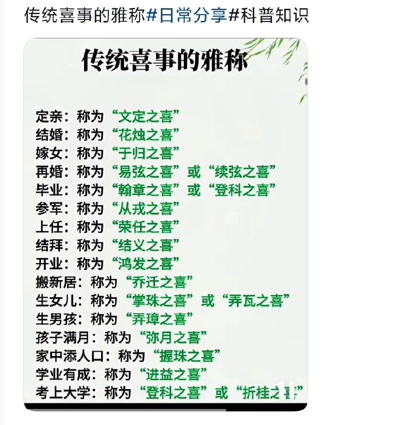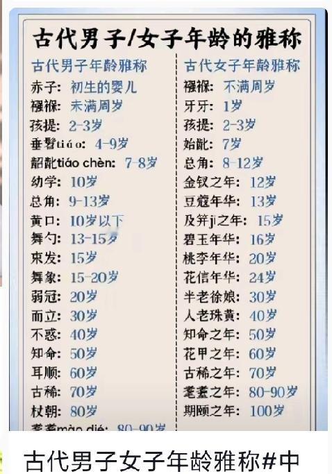你明白几个之喜,结婚叫花烛之喜,再婚叫易弦之喜,嫁女叫于归之喜,定亲叫文定之喜,男子的寿辰叫悬弧之庆,女子的寿辰叫设帨之辰,生子叫生子弄璋之喜,生女叫弄瓦之喜,高中叫登科之喜,升官叫高迁之喜,搬家叫乔迁之喜,升学叫折桂之起喜,参军叫从戎之喜,结拜叫结义之喜。 一人之下万人之上中的一人指老婆。老婆的老,是指月老,婆是指孟婆,始于月老,终于孟婆。背井离乡的井,指父母而不是水井,不到黄河心不死的黄河指乌江,王婆卖瓜中的王婆啊,其实是个男的,原名叫王坡,玩物丧志的物是指仙鹤,一石二鸟的鸟指鸽子,惊弓之鸟的鸟指大雁,关关雎鸠的雎鸠指鱼鹰,鸿鹄之志的鸿鹄是指天鹅,劳燕分飞的劳,是指伯劳鸟,鸠占鹊巢的是杜鹃,自从一碧风光后,几度飞来不见人,说的是燕子,我国老百姓从宋朝开始吃一日三餐轻如鸿毛,中的鸿毛指大雁的羽毛,没齿难忘的没齿是指一辈子,可怜天下父母心,是慈禧说的,99岁被称作白寿,88岁被称作米寿,因为米字拆开来呀是88,77岁被称作喜寿,0~1岁叫襁褓,2~3岁叫孩提,10岁以下叫黄口,8~13岁叫总角,12岁叫金钗之年,13岁叫豆蔻之年,男子13~15岁叫舞勺之年,20叫结发之年,男子加冠女子加笄,30是而立之年,三十而立40不惑,50知天命,60耳顺,70是古来稀,80.90时叫耄耋之年。