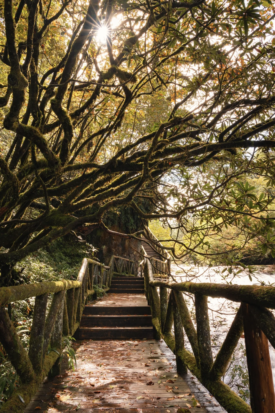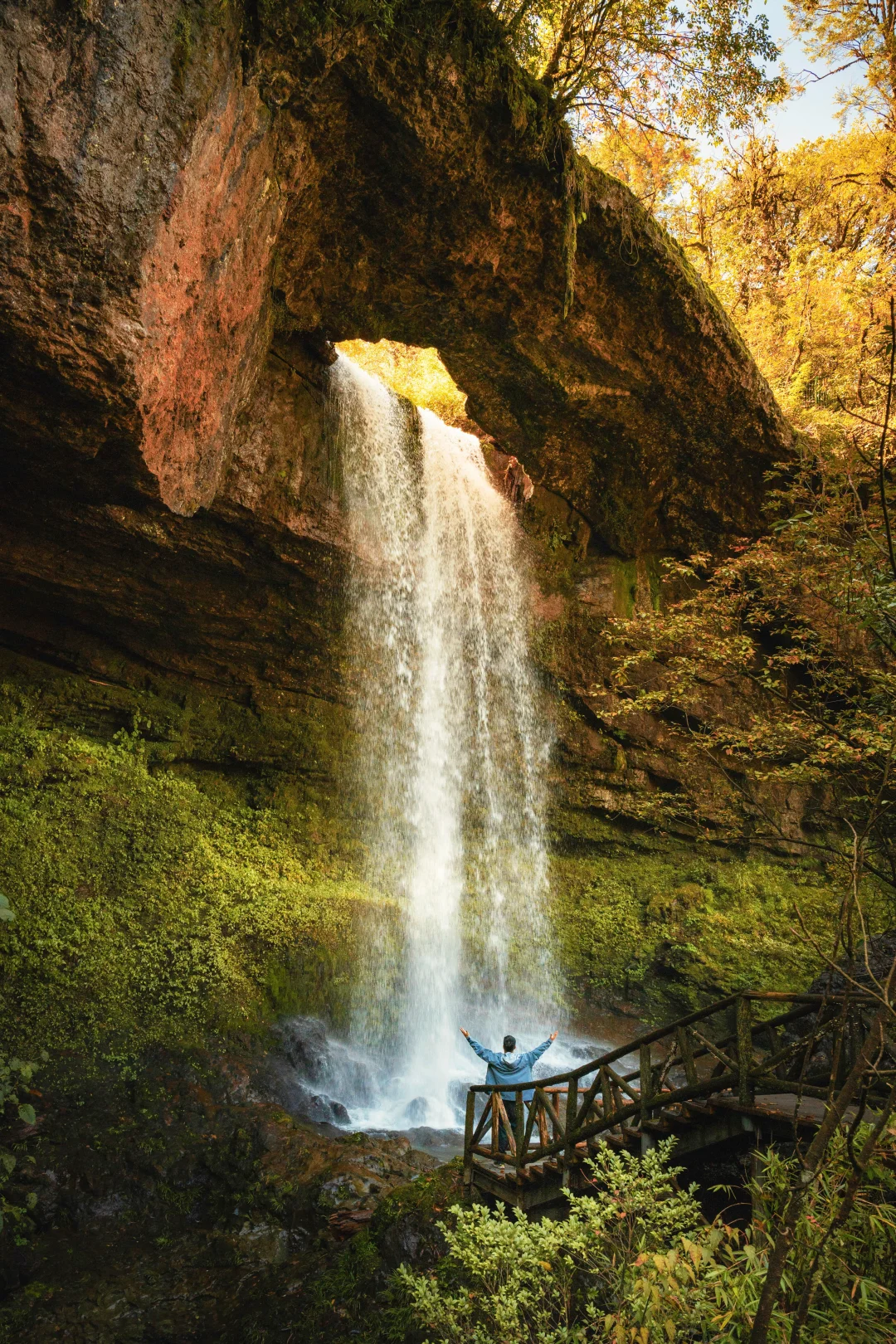 这是一条环形徒步栈道,如果天气好,能够远眺远处的世界第二大、亚洲最大桌山—中国桌山。徒步中途会有一处30米高的天生桥瀑布,旁边有一座石桥,正是景点得名的由来。再往前走,沿着溪流向上,这一段也是彩林比较集中的区域,