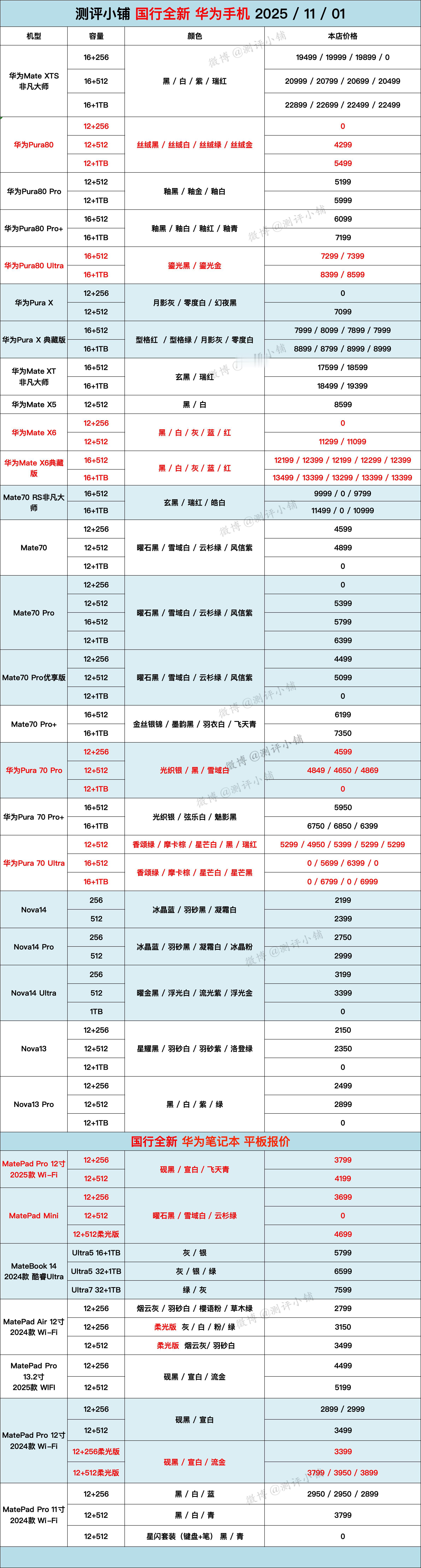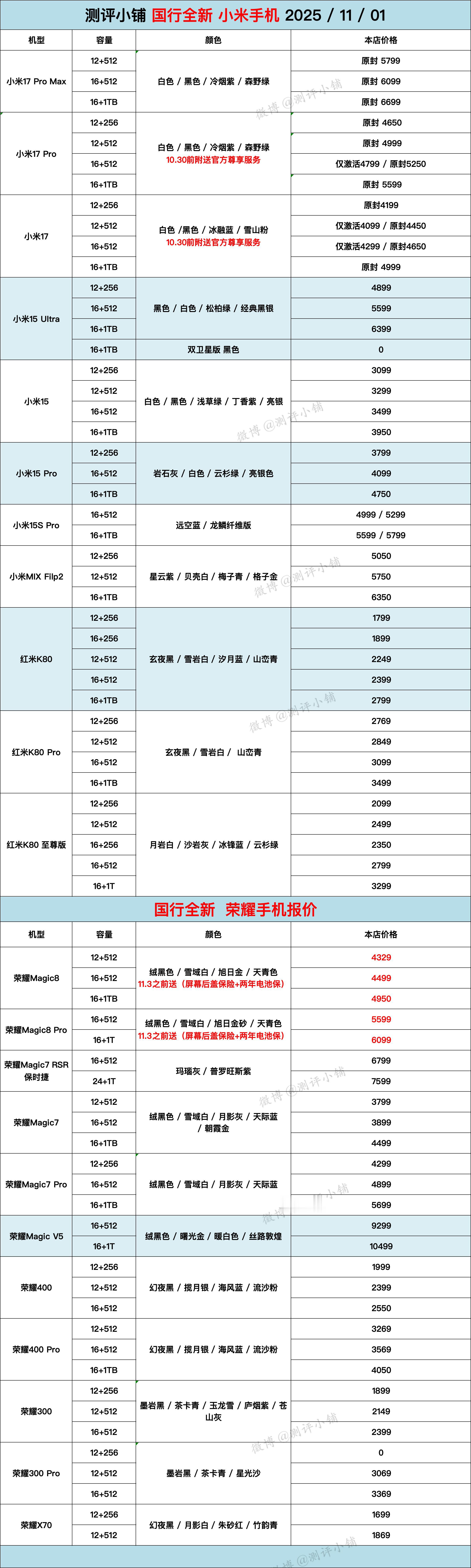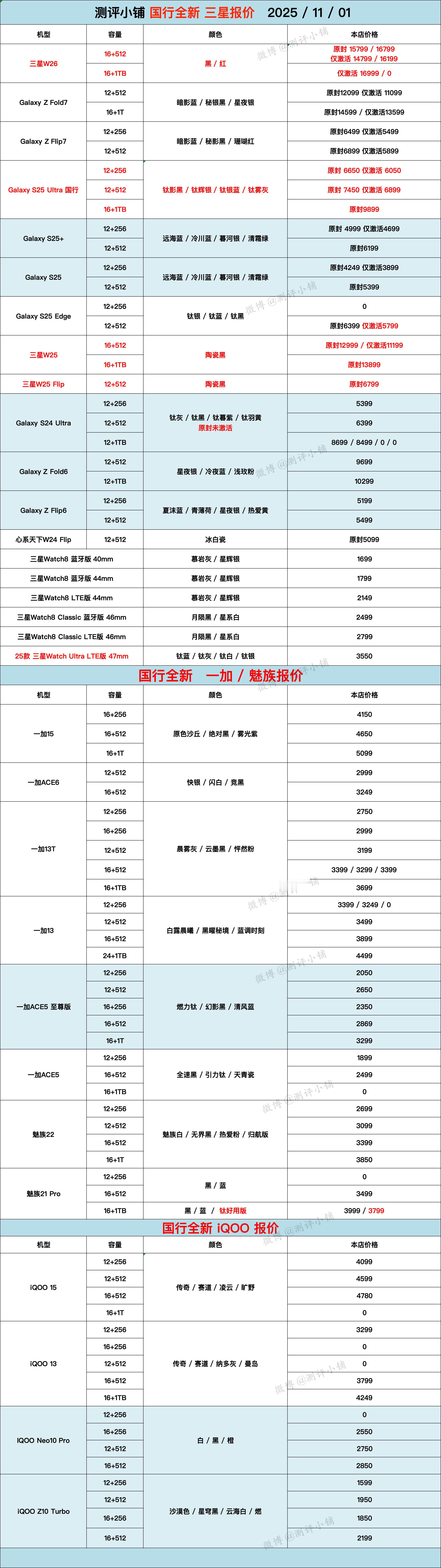 11-01国行全新机,iQOO15系列上新,iPhone系列、iPad系列,华为Mate XTs,荣耀400、荣耀Magic7系列,红米K80系列,OPPO Find X8全系列,vivo X200 Ultra等更新。 ​​​