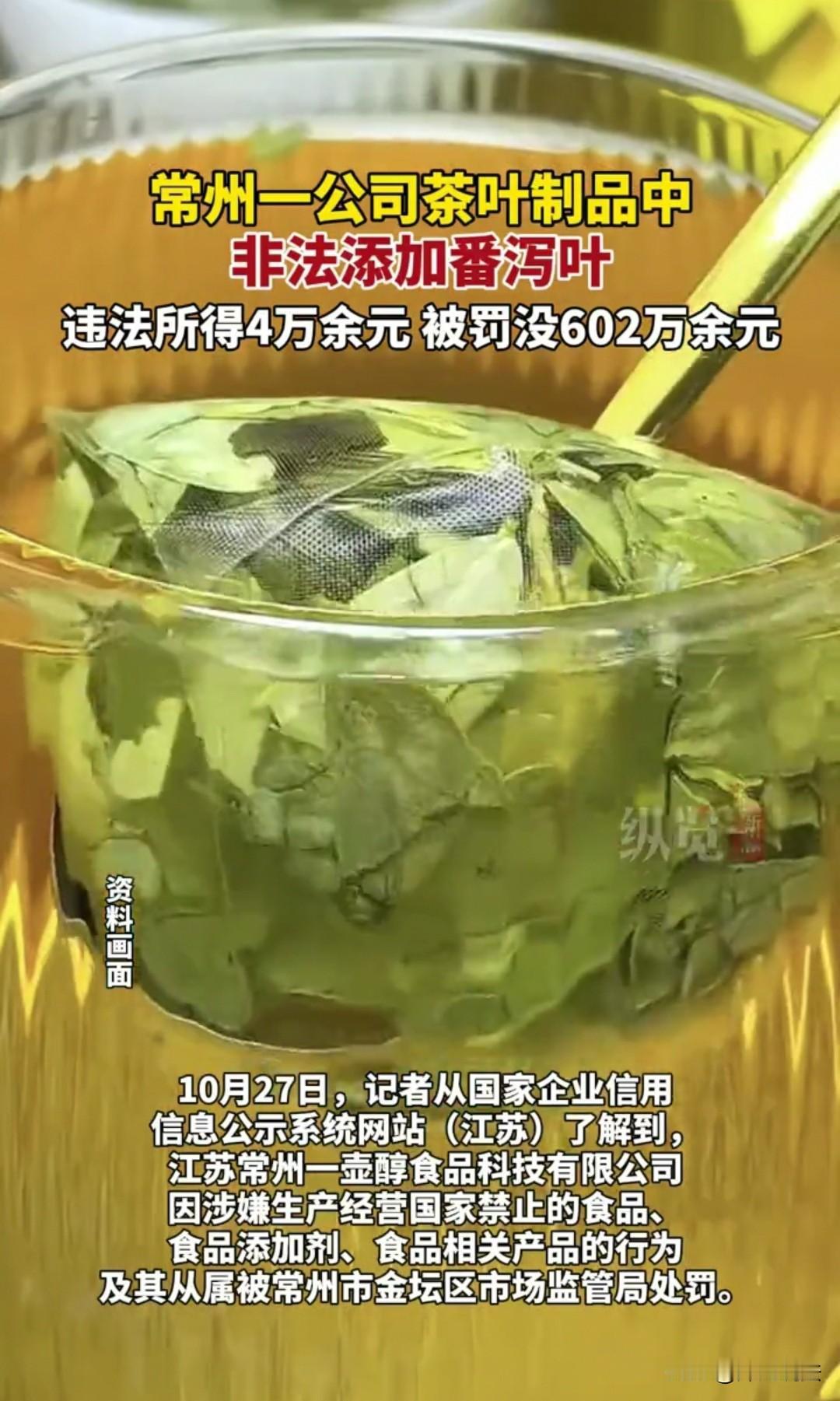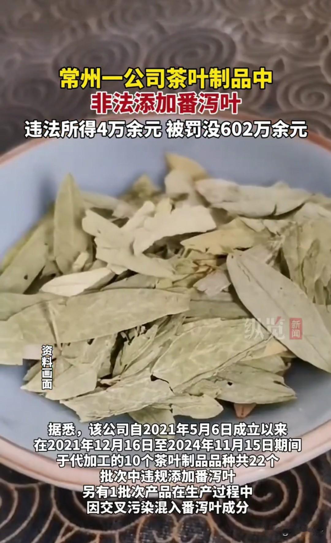 常州,一茶叶公司在制造过程当中非法添加了番泻叶,被罚5981557元,没收4万余