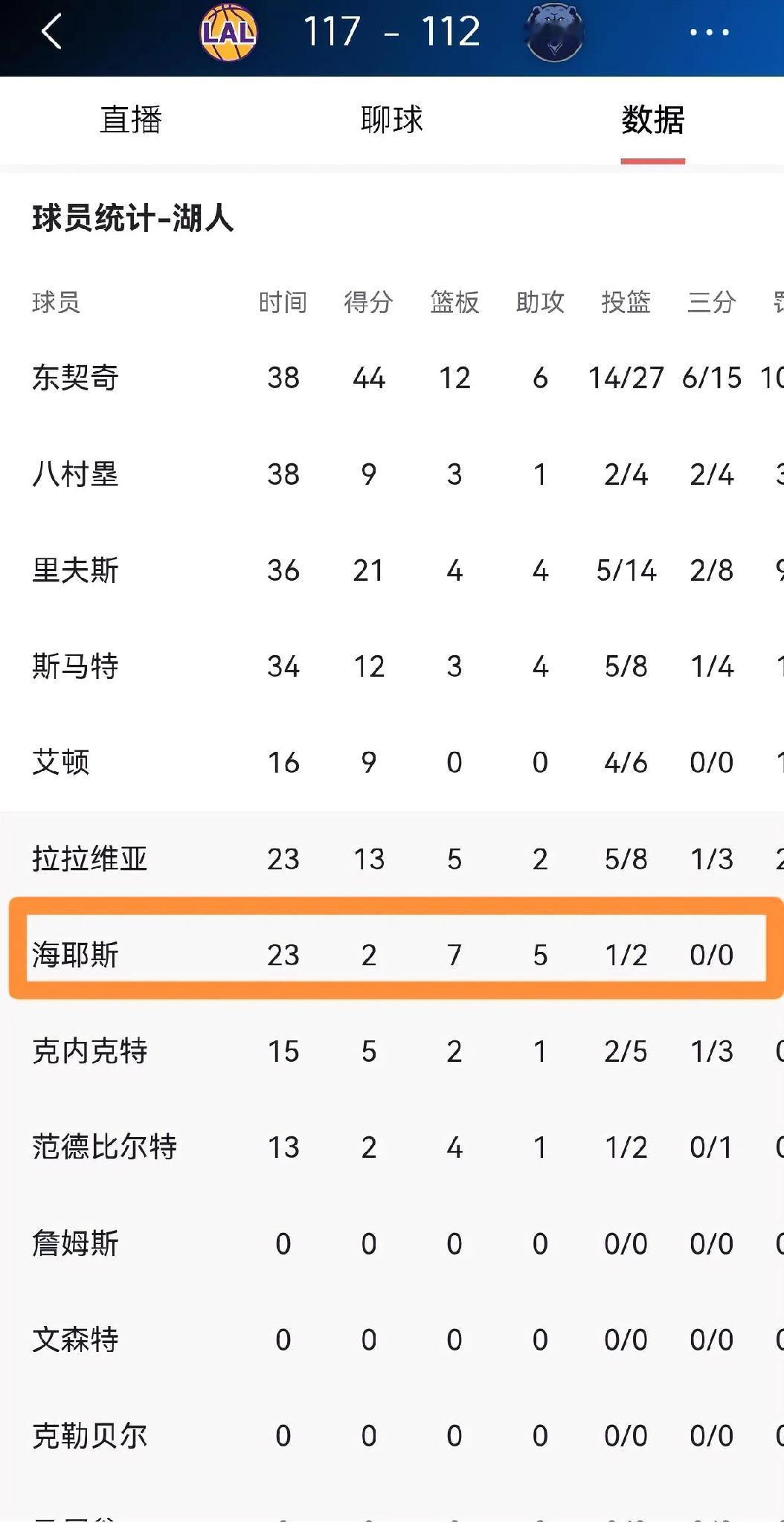 湖人队的明星球员东契奇赛后采访时展现了出色的沟通技巧。湖人在客场以117:112拿下对阵灰熊的胜利后,东契奇特意表扬了队友海斯的优异表现,他表示:“我觉得一定要特别称赞一下海斯,他在今晚的比赛里表现得实在太精彩了。” 如同东契奇所提到的那样,这场比赛海斯确实发挥出色。他在场上的正负值达到了全队并列最高的+15,无论是进攻还是防守端,海斯都为球队带来了极大的支援。
