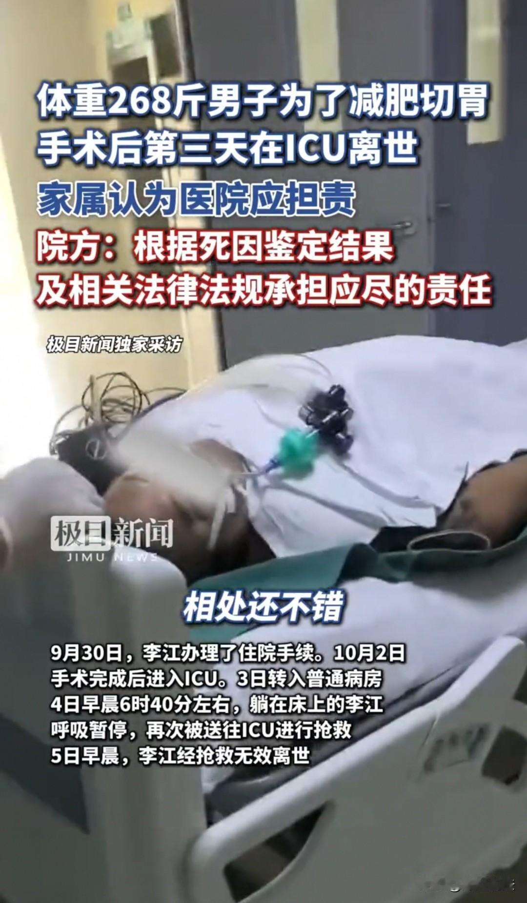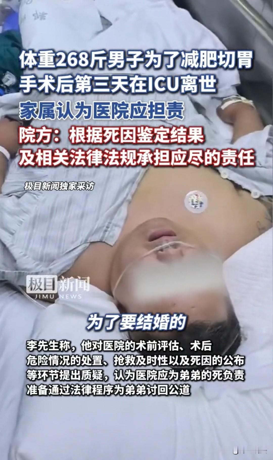 郑州,一名268斤的男子,想去见女友家长时形象好一些,便去医院准备做胃切除手术。结果术后第三天进了ICU,第六天去世。家属认为是医院术前评估不到位,要求院方赔偿;院方则表示,术前已进行了全面的评估,事后也积极展开抢救,不存在过错。不过目前双方已委托第三方进行鉴定。 李先生看着没有呼吸的弟弟,痛心疾首地说道:“你们是怎么进行评估的?我的弟弟怎么就没有了呢?” 李先生的弟弟长得挺帅的,就是有点胖,268斤的体重,导致他36岁还没有结婚。 不过现在弟弟谈了一个女朋友,相处得还不错,对方也不嫌弃弟弟胖,还准备带弟弟去见自己的家长。 弟弟也特别高兴,这可是他梦寐以求的一幕,现在终于要实现了。 既然要见女友的家长,怎么样也该把自己的形象整理一下。 他想通过运动减肥,可没一会儿就累;想通过控制饮食减肥,每天不吃东西又受不了。 最后弟弟就求助专业的医生,问他这种情况该怎么办。 医生告诉弟弟,最简单直接的办法就是切除一部分胃功能,这样食量就会减少,体重也会随之降低,人以后就变帅了。 弟弟觉得这个办法很好,自己从出生到现在就一直在尝试减肥,能想到的方式都试了,却都没有成功。 既然医生说可以通过这种方式减重变帅,那何不尝试一下呢? 于是弟弟就去做了全面的检查,医生也评估后认为弟弟目前的情况可以做这种手术,于是在9月30日,弟弟就办理了入院。 其实家属对弟弟做这么危险的手术还是很担心,一开始并不同意,不过弟弟坚持要做,大家也只能祈祷一切平安。 然而,手术后不久,弟弟就出现了不适,赶紧被送入ICU。 经过抢救后,在10月3日,弟弟又转入了普通病房。 这期间,家属们的情绪也跟着起伏不定,生怕弟弟受不了这样的折腾,反而觉得弟弟胖一点,不去挨这一刀,也不是什么坏事。 可现在已经晚了,在10月4日早上6:40,弟弟就停止了呼吸,脸上也没有了血色。 医生立即将弟弟转入ICU进行抢救,可不幸的是,在10月5日,弟弟还是离世了。 看着弟弟活蹦乱跳地进了医院,现在却冰冷地躺在床上,家属们感觉像做梦一样,而这个梦不是美梦,而是噩梦。 可这个噩梦始终不会醒,弟弟真的走了,再也回不来了。李先生看着没有呼吸的弟弟,痛不欲生,一直念叨着:“你干嘛要这样减肥呢?胖一点有什么不好啊?” 李先生认为是院方的问题:弟弟术前,医生为什么没有考虑到会出现这样棘手的情况?为什么没有做全面的评估? 而且手术后弟弟先进ICU,后来转入普通病房,之后又进ICU,院方到底有没有针对手术后的危险情况制定应急预案? 可是院方表示,弟弟来的时候,他们是做了评估的,他的体重和身体状况符合手术条件,也没有发现手术禁忌症。 并且出现紧急情况后,他们也积极响应、全力抢救,没有丝毫懈怠。 所以院方认为自己没有过错,整个流程都是合法合规的。 李先生听到后,实在难以接受:“一切都正常,为什么我弟弟就没了呢?”于是直接投诉到了卫健委。 最后,双方都申请第三方进行医疗鉴定,不过院方也表示,事情发生后,他们会承担相应的后果,但必须先界定责任,才能按照相关法律法规进行赔偿。 有人说,做手术都有风险,尤其是这种手术,能靠毅力、运动、节食减肥的,何必去冒这个险! 还有人说,每天吃三两饭,再用清水煮萝卜、煮白菜,一个月下来怎么也能瘦个十斤二十斤,为什么偏偏要选最危险的路走? 1、院方如果术前未通过多学科团队(MDT)全面评估个体风险,可能构成诊疗过错。 依据《中国肥胖及2型糖尿病外科治疗指南(2019版)》,袖状胃切除术需满足BMI≥32.5或BMI≥27.5合并代谢综合征(患者BMI 43.8符合标准),但院方需排除心肺障碍等禁忌症。 2、院方若仅强调“快速减重”而隐瞒胃漏、死亡等风险,属违规。 根据《医疗纠纷预防和处理条例》第十三条,院方需书面明确告知手术风险、替代方案(如运动节食)并获签字确认。 3、院方如果未及时启动多学科会诊或规范抢救,可能被认定为抢救不力。 患者术后反复转入ICU,提示可能存在并发症处置不当。按《手术并发症应急处理预案技术指南》,院方需建立快速响应机制。 4、院方需举证自身尽到合理诊疗义务(如提供完整病历)。 依据《民法典》第一千二百一十八条,医疗损害适用“过错责任”,但院方若存在违反诊疗规范、隐匿病历等情形,可直接推定过错。 5、如果院方违规(如无资质行医),将面临《医疗机构管理条例》罚款、吊销执照等处罚。 按《民法典》第一千一百七十九条,赔偿范围涵盖医疗费、死亡赔偿金(一线城市可达200万+)、精神损害抚慰金(5-10万)等。 对于此事,大家如何看?素材来源于极目新闻2025年11月1日报道。