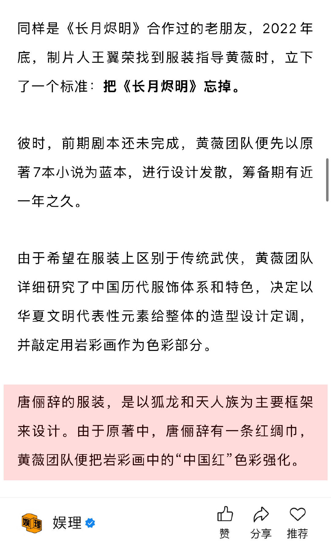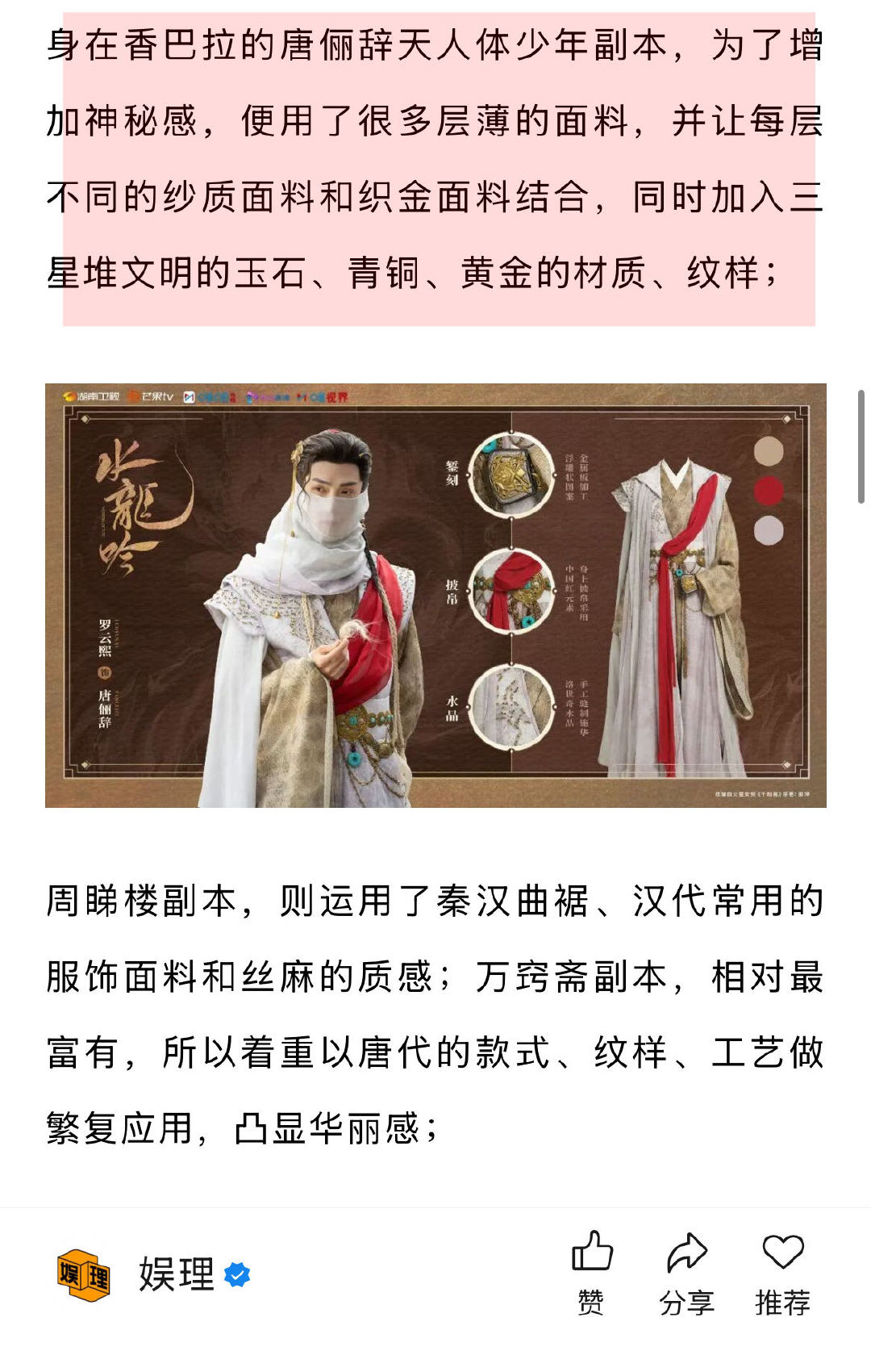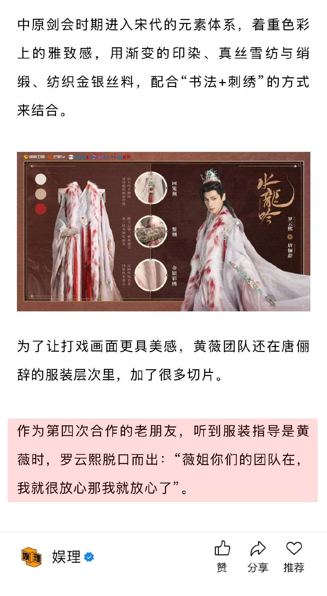 黄薇说罗云熙是天生拍古装的 黄薇曾明辉回应被网友监工 2022年底,制片人王翼荣找到服装指导黄薇时,《水龙吟》的前期剧本还未完成,黄薇团队先以原著7本小说为蓝本进行筹备。唐俪辞的服装,是以狐龙和天人族为主要框架来设计。由于原著中,唐俪辞有一条红绸巾,黄薇团队便把岩彩画中的“中国红”色彩强化…娱理独家↓