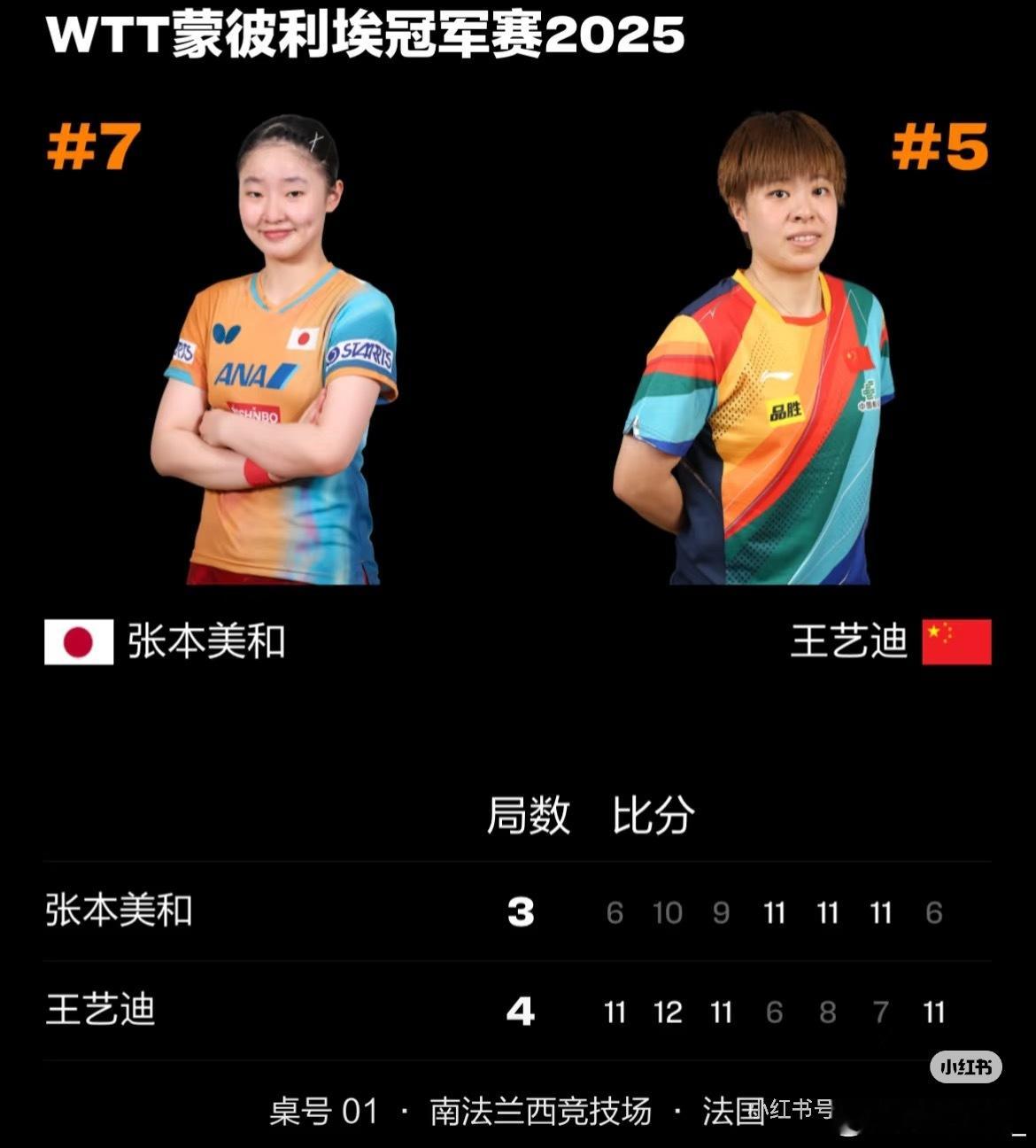 王艺迪成国乒蒙彼利埃独苗早上起来就看到王艺迪赢了的消息,光看对手就知道是场硬仗,并不好打,王艺迪太牛了。这场比赛真是跌宕起伏啊,王艺迪3-0火爆开局,我还以为稳了,结果张本美和顽强追成3-3,第五局就开始揪着心看,第七局更是提到了嗓子眼,还好王艺迪守住了擂台,以4-3拿下比赛,晋级下一轮,离冠军又近了一步,恭喜大迪打走了日本最后一个队员,晋级四强!
