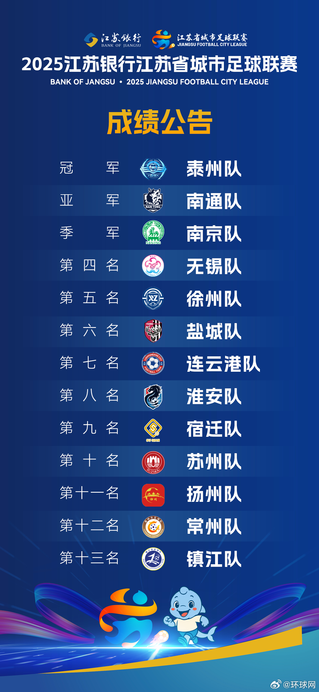 【#苏超13队最终排名发布#! 】11月1日晚,备受关注的苏超(江苏省城市足球联赛)迎来了最终的争冠大战。在南京奥体中心体育场62329名球迷的现场见证下,南通队与泰州队上演巅峰对决。最终常规时间两队战成0比0,经过点球决胜,泰州队以4比3击败对手,收获了本届赛事的冠军。