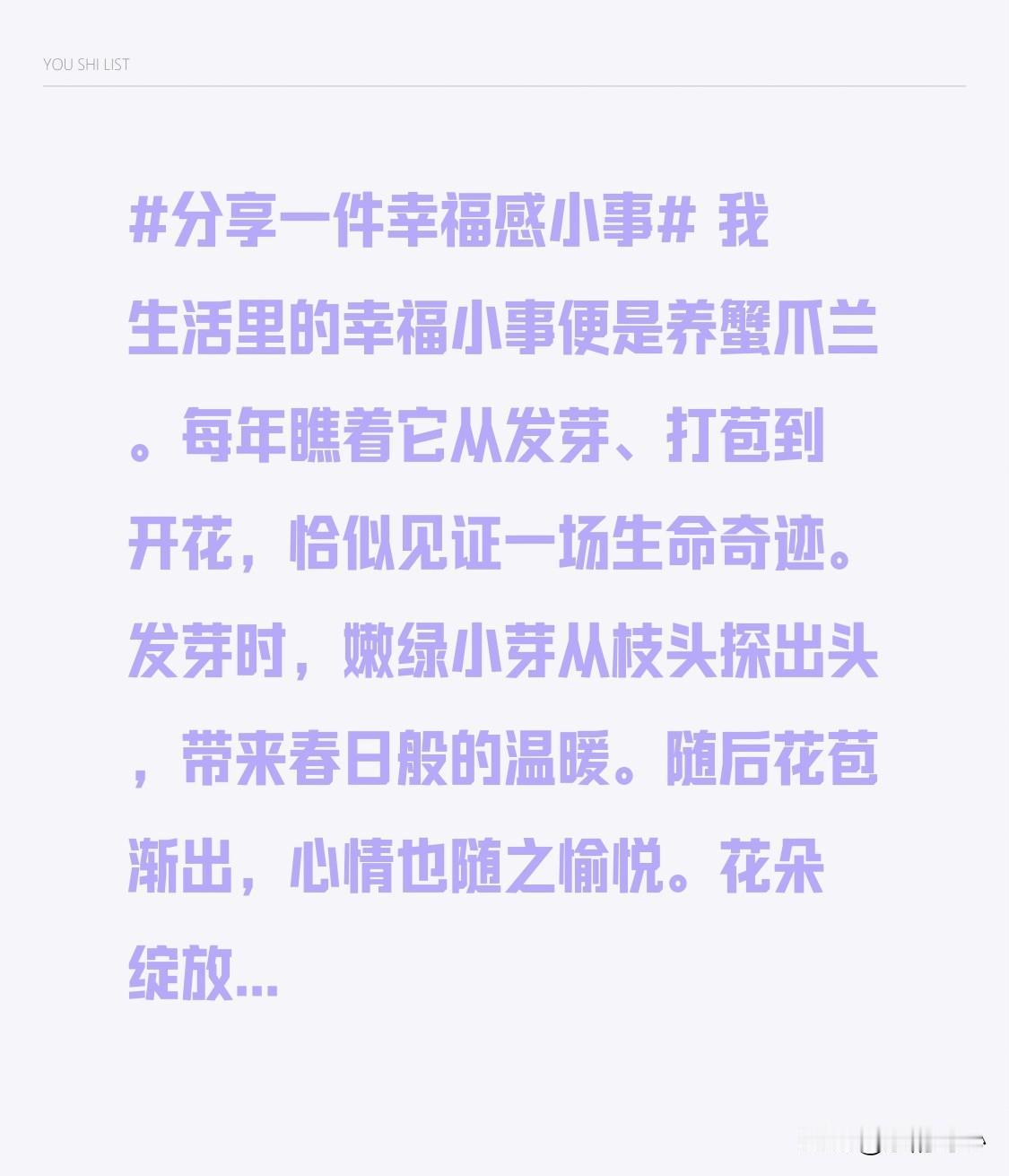 我生活里的幸福小事便是养蟹爪兰。每年瞧着它从发芽、打苞到开花,恰似见证一场生命奇迹。 发芽时,嫩绿小芽从枝头探出头,带来春日般的温暖。随后花苞渐出,心情也随之愉悦。花朵绽放,满是人间烟火气。 养花重在欣赏生长过程,而非仅看花。它是生活的浪漫点缀,让人卸下疲惫。每次看到新变化,所有迷茫都能释怀。生活苦涩,养养蟹爪兰添点甜,幸福藏在平凡日常。