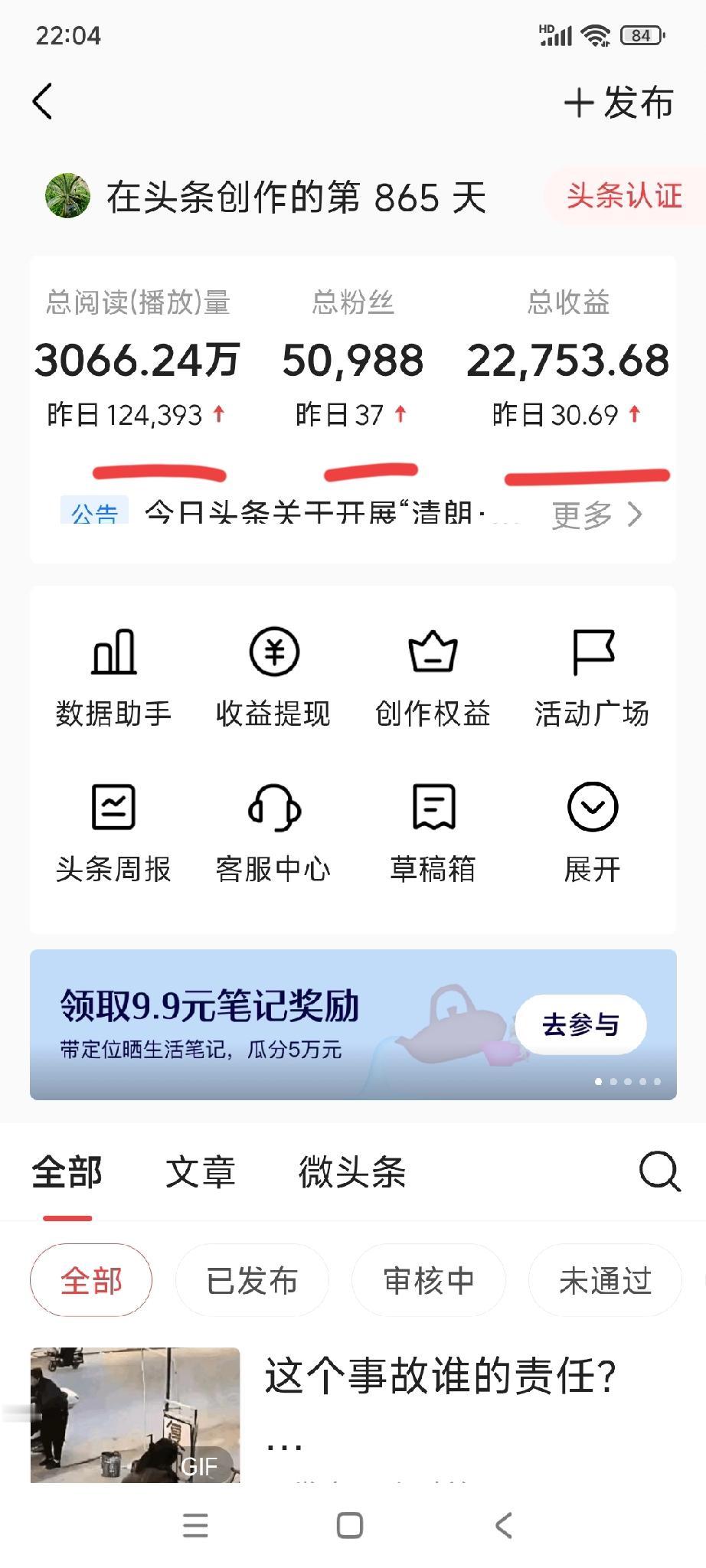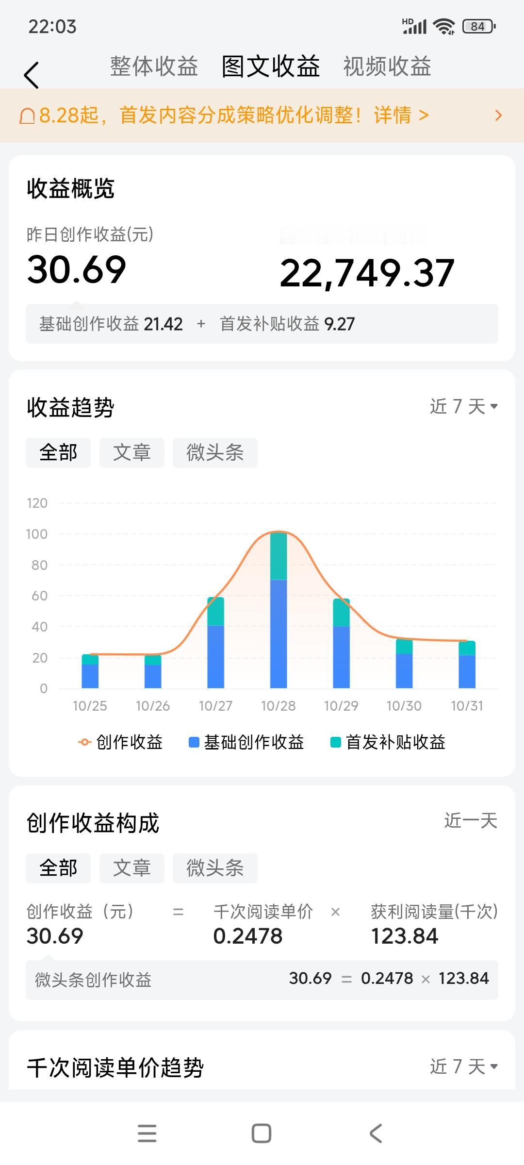 大家看看我的收益,前天阅读量是124393,收益30.69元,千次阅读量单价0.2478。 这个月我每天阅读量都很高,平均都在10万左右,有时候阅读量也有二十多万,可收益少的可怜。 也可能我写不好,水平有限,但阅读量上去了,千次阅读量单价太低。 今天突然限流了,发了四个作品,每天作品展现量都很低,不知道是什么原因。 这样下去,我是没法写了,一天在头条上十几个小时,早上5点开始写作,回友友评论,到晚上十二点还在忙。累得腰疼背酸,一天挣了三核桃两枣,还不如捡疲品,这样累有病了,得不偿失。 看了别人晒的收益,一万多的阅读量,收益都比我高,不知道这千次阅读单价怎么核算的,我的收益是全网最低单价,感觉自己水平太低,丢死人了。 朋友们,你们的千次阅读单价是多少?欢迎讨论!