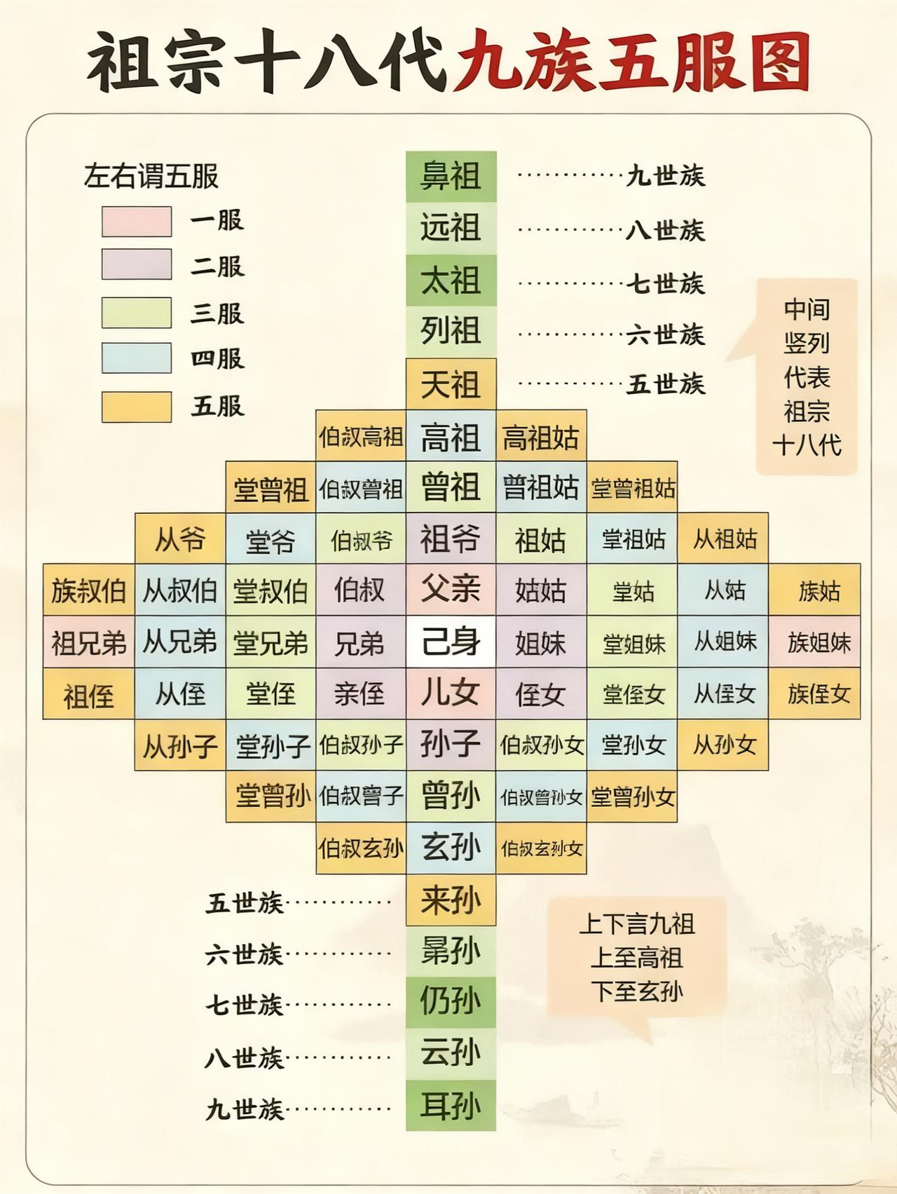 一张图带你了解祖宗十八代,以及九族和五服关系图,真的是太全了! 这张图将“祖宗十八代”的时间广度、“九族”的社会深度和“五服”的亲疏刻度完美地结合在一起。它不仅仅是一张关系图,更是一面大镜子,映照出传统文化中对家族、对血脉、对传承的极致重视。在现代社会,这些知识用处不大了,生育率严重降低,但了解这些古老的文化符号,依然能帮助我们更好地理解自己的根,维系那份跨越时空的亲情与敬意。
