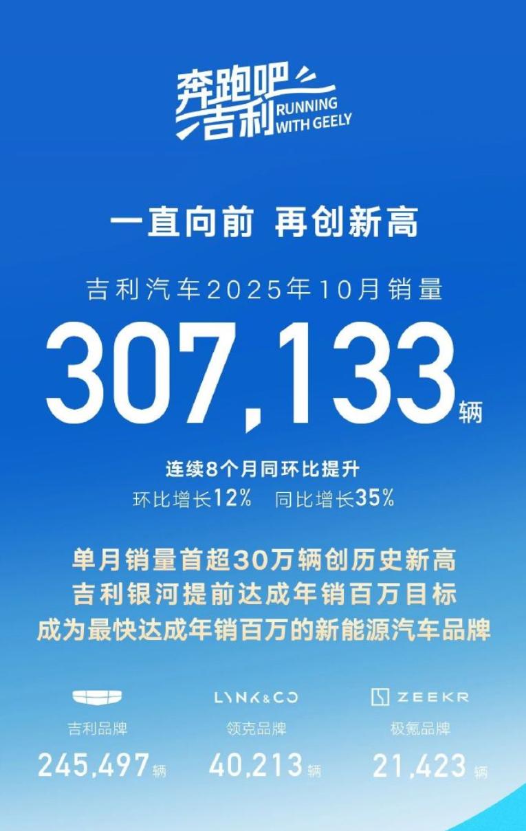 吉利银河10月破百万辆 吉利银河10月单月销量达127476辆,再创历史新高,同