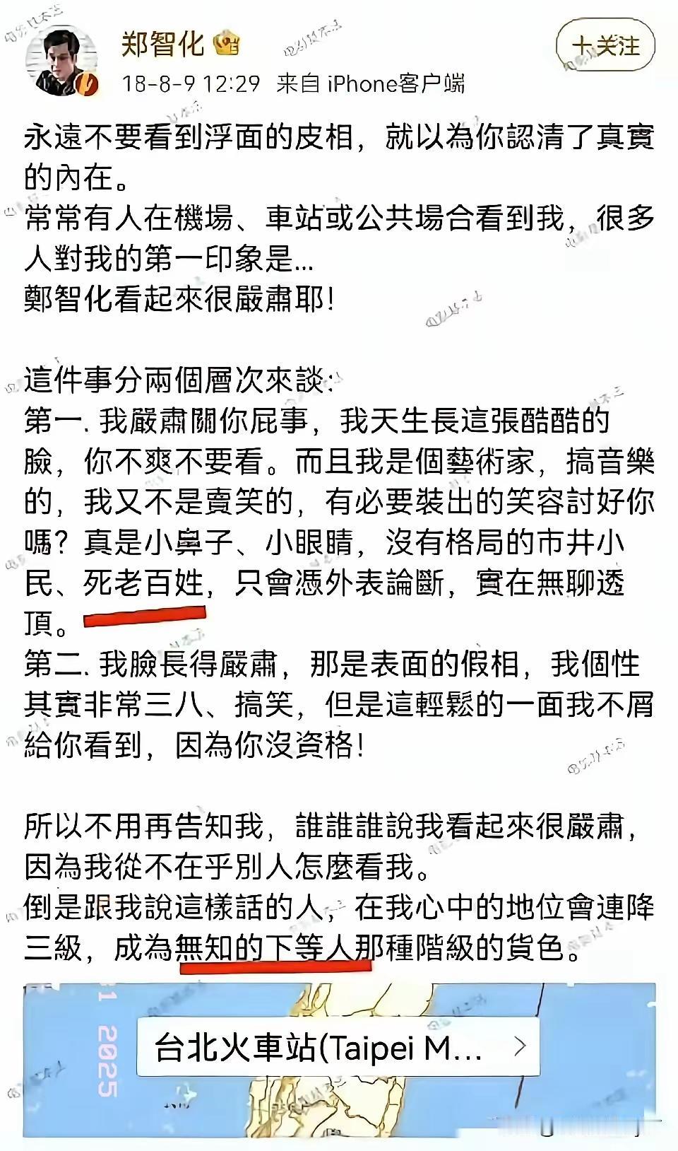 郑智化的笑容哪里去了? 郑智化为什么这么严肃?这段话是郑智化2018年发的,感觉到很高傲,还有国统区的那种牛逼哄哄的感觉。再看一看他在深圳机场的这一次表现,对中国人民,对中国大陆这种嫌弃是由衷的,这种鄙视依然是高高在上。 实际上我们不明白为什么郑智化对中国大陆的各种不满?他来大陆演出这么多年,挣了那么多的钱。甚至是说可以几辈子花不了。正常来说,他应该感谢大陆人民,感谢大陆为他提供了方便,提供了舞台,提供了机会。但他并不是感激,形式上看是他觉得需要提高服务,内涵上是他骨子里有一种,俯视的心态。这不排除这样的人就是隐形台独。 因而我们对郑智化这种对大陆不友好的人要持之以鼻拒绝他,不再惯他毛病。从这个角度上说,郑智化他的毛病都是大陆给惯出来,你以一个对待残疾人的心态可怜他,他反而用一种高高的岛民心态对待大陆人民。 感觉郑智化的艺术生涯,以及他的在大陆的演出已经穷途末路了,不过他的年纪也应该到了收摊的时候了。以这种姿态退出艺术舞台,他自己是否以为自己不幸否耶?