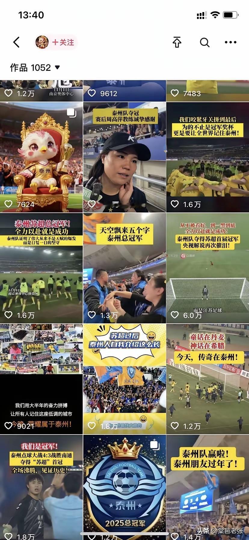 网上传言泰州文旅昨天连发49条视频,还有100条在审核,我本以为是夸张说法。直到刷到凤凰升空举起奖杯视频,点进泰州文旅主页,才知网友所言非虚。 泰州获第一届“苏超”冠军,这是大喜事。泰州文旅工作人员兴奋到失眠也不奇怪,毕竟是冠军,自然要好好宣传庆祝。我提议,泰山可免费开放一个月,让大家沾喜气,吸引更多游客感受泰州魅力。说不定借此东风,泰州能在旅游界再火一把。