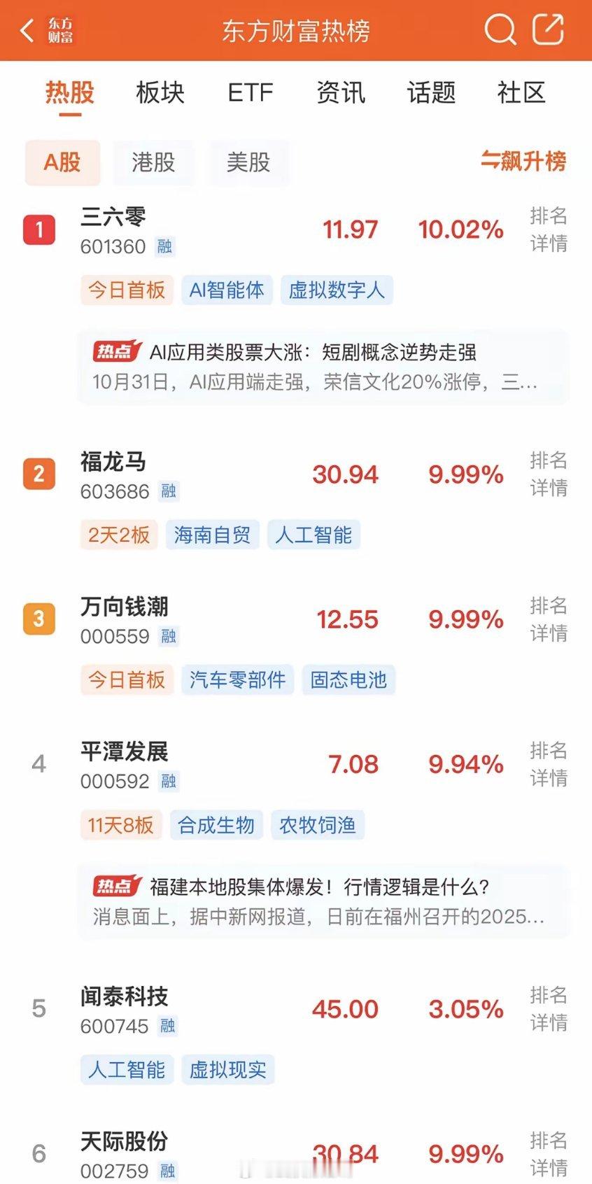 同花顺: 1.平潭发展 2.山子高科 3.福龙马 4.三六零 5.万向钱潮 6.东方精工 7.多氟多 8.天际股份 9.大众公用 10.时空科技