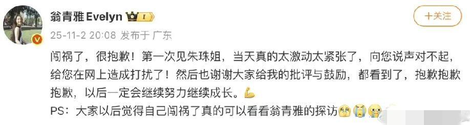 《“闯祸致歉”背后,是追星失度还是成长契机?》 近日,一则道歉声明在网络上引发了不少关注。有人在首次见到朱珠后,因激动紧张“闯祸”,赶忙在网上公开致歉,言辞恳切,不仅向朱珠表达了歉意,还对网友的批评与鼓励表示了感谢,并承诺会继续努力成长。 这看似是一场普通的追星小风波,实则反映出当下追星文化里的一些乱象。追星本是一件正常的事,明星身上的闪光点能激励粉丝变得更好。但如今,部分粉丝在追星过程中逐渐失了分寸。就像这次“闯祸”事件,激动紧张虽是人之常情,可因此给明星造成困扰,就有些不妥了。粉丝的过度热情,有时会让明星陷入尴尬境地,甚至侵犯到他们的私人空间。 不过,从另一个角度看,这位粉丝能及时认识到错误并公开道歉,也展现出了一定的担当。在网络舆论的风口浪尖上,能直面自己的过错,这份勇气值得肯定。这也给其他追星的人提了个醒:追星要理智,要在尊重他人的基础上表达自己的喜爱。 同时,这一事件也给娱乐圈和粉丝群体敲响了警钟。娱乐圈应加强对粉丝行为的引导,营造健康的追星氛围;粉丝们也该反思自己的追星方式,将对明星的喜爱转化为自我提升的动力。希望这起“闯祸”事件,能成为追星文化走向成熟的一个契机,让粉丝和明星都能在和谐的环境中共同成长。