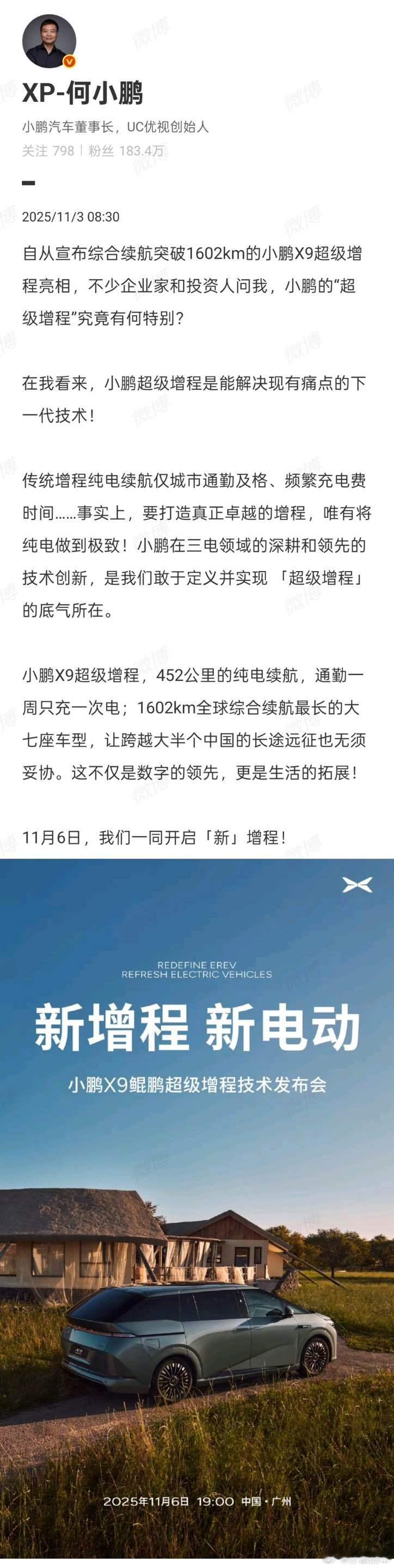会做纯电但做不了增程?还真不是,小鹏作为一家纯电老兵,做增程技术,一搞就在最高端的MPV上搞了个“超级增程”小鹏X9超级增程技术发布定档11月6日