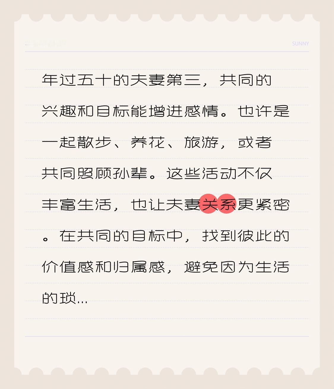 年过五十的夫妻该怎么相处才算是性格适合?????? 年过五十的夫妻,走过了半个世纪的风风雨雨,彼此之间的感情早已沉淀出深厚的温度。这个年龄段的夫妻,或许不再追求年轻时的激情澎湃,但更渴望的是一种成熟、稳重、彼此理解的陪伴。那么,什么样的相处方式,才能让他们的生活更加和谐、幸福呢?答案或许藏在“性格适合”这几个字背后。 首先,包容与理解成为关键。这个年龄段的夫妻,性格差异难免会被放大。有的人性格温和,有的人偏执固执;有的人喜欢安静,有的人热爱社交。学会尊重对方的习惯和偏好,不强求,不指责,是维系感情的基础。比如,丈夫喜欢早起锻炼,妻子偏爱晚间阅读,彼此尊重这些不同,让生活多一份宽容和自在。 其次,沟通的艺术尤为重要。年过五十的夫妻,很多时候会因为琐事而积累不满。坦诚表达自己的感受,倾听对方的心声,避免情绪的堆积。可以每天抽出一点时间,聊聊彼此的心情、生活的点滴,哪怕只是简单的“今天过得怎么样”。这份细水长流的交流,能让彼此更懂对方,也更容易找到相处的节奏。 第三,共同的兴趣和目标能增进感情。也许是一起散步、养花、旅游,或者共同照顾孙辈。这些活动不仅丰富生活,也让夫妻关系更紧密。在共同的目标中,找到彼此的价值感和归属感,避免因为生活的琐碎而疏远。 最后,保持自我,互相尊重。每个人都需要有自己的空间和爱好,不要因为年龄而放弃自我。保持身体和心灵的活力,才能带来更多的生活热情,也让对方看到一个积极向上的自己。 其实,适合的性格相处,不是完美的模仿和一致,而是彼此的包容、理解和共同成长。每对夫妻都可以在岁月的洗礼中,找到属于自己的一份和谐与幸福。你觉得呢?你们的相处中,又有哪些“黄金法则”呢?欢迎留言分享,让我们一起探讨这份岁月沉淀下的真情!夫妻相处两原则 夫妻相处要诀 夫妻相处窍门 中年婚姻关系
