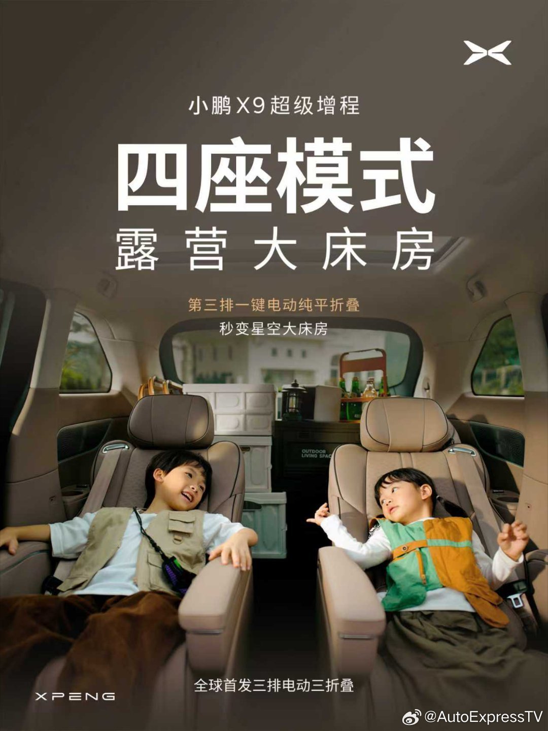 一键百变!小鹏X9超级增程全球首发电动三折叠,凭借第三排四六电动折叠纯平收纳技术,一键灵活变换布局,轻松打造四人露营、五人骑行、六人携宠或七口之家等多种出游场景,结合2514L同级最大纯平储物空间,百变场景随心定义,各种装备自由收纳,轻松装下全家的的热爱!