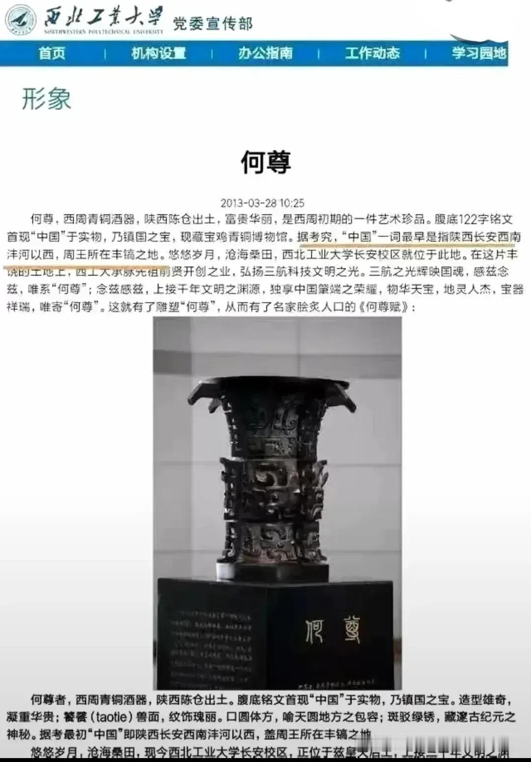 何尊铭文,宅兹中国。 最早的中国到底指哪里? 1、中国国家博物馆。 删除有关洛邑表述,增加丰镐表述。 2、中国考古博物馆, 依旧表述为现在的洛阳地区。 两大权威博物馆, 为何以前统一的表述, 如今却出现分歧了? 到底谁是谁非? 恐怕是考古博物馆要与时俱进了。 让历史说话, 让周人的金文说话, 恐怕比后世文献以及推理,推测, 语境关联要真实的多。 先看国博馆的介绍。 以前是根据国博馆策展人翟胜利的解读,何尊铭文记载了周成王继承周武王遗志,营建新都成周之事,“宅兹中国”意味着居于天下之中,这里的“中国”指的是洛阳地区 。 但近年来,有新的学术研究和考证认为,武王克商时洛阳城尚未形成,而丰镐是周武王的都城,“中国”应指丰镐地区。国博馆可能为了避免争议或更准确地反映学术研究的现状,在介绍何尊时去掉了最早的“中国”指洛邑的相关表述,同时增加了丰镐地区。 再看中国考古博物馆,要么依旧沿用传统的学术观点,要么尚未根据新的学术研究成果对介绍内容进行调整,所以仍提及洛阳。 再看2013年西工大对何尊铭文解读。 据考,最初中国即陕西长安西南沣河以西,盖周王所在的丰镐地区。 到底以国博馆为准还是考古博物馆为准? 还是以历史教科书为准吧。毕竟历史教科书是最新研究成果和的最新的考古成果的综合,并经过更多的权威专家审定的结果,比博物馆策展人的解读,要权威的多,而且更贴近和符合历史事实。 历史教科书摘要。 武王灭商,建立周朝,定都镐京。 对何尊介绍如是说。 何尊铭文提到,武王灭商, 决定建都于天下之中:“宅兹中国”。 因此,宅兹中国,就是宅兹镐京。
