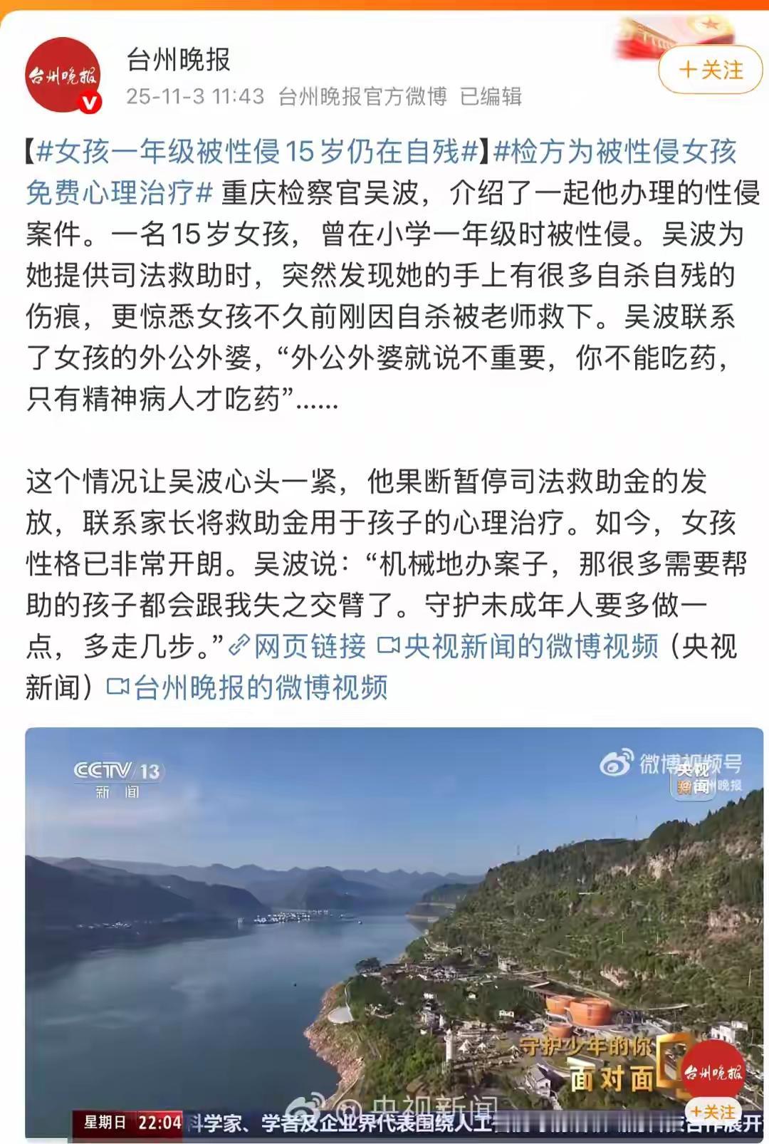 当重庆检察官吴波看到那个15岁女孩手臂上密密麻麻的自残伤痕时,他知道,这起看似“流程已结”的性侵案,远没有结束。 这个女孩,在七岁读小学一年级时就遭遇了性侵,可这份创伤像一颗埋在心底的毒瘤,在她成长的十几年里不断溃烂。到了15岁,她用刀片在手臂上一次次划下伤口,不久前甚至试图自杀,被学校老师及时发现才救了回来。 这段描述揭示了一个深刻而令人痛心的社会问题——未成年人遭受性侵后带来的心理创伤及其复杂的后续影响。女孩从七岁开始遭受性侵,长时间的创伤未能得到及时有效的干预,最终演变为自残和自杀的行为,反映出心理健康和保护机制的严重缺失。 吴波检察官在面对女孩手臂上的伤痕时,敏锐地察觉到事情远未结束,表明他不仅关注案件的表面,而是意识到背后隐藏的更深层次的问题。这种洞察力体现了司法人员对未成年人权益的高度责任感,也提醒社会各界对未成年受害者的心理创伤要给予更多关注和专业帮助。 此事件提醒我们: 加强未成年人保护:完善相关法律法规,建立更全面的保护体系,防止性侵事件发生。 心理健康干预:对受害者提供及时的心理疏导和治疗,帮助他们走出阴影。 社会共同关注:公众、学校、家庭应共同关注未成年人心理健康和安全问题,营造安全、关爱的环境。 案件深度调查:不仅追究施害者的法律责任,还要查明事件背后的社会原因和保护漏洞,从根源上防止类似悲剧重演。 这起案件是一个警示,呼吁我们共同努力,保护未成年人权益,减少悲剧的发生,帮助受害者走出阴影,迎来希望的未来。性侵案 未成年人强奸案 未成年女生性侵