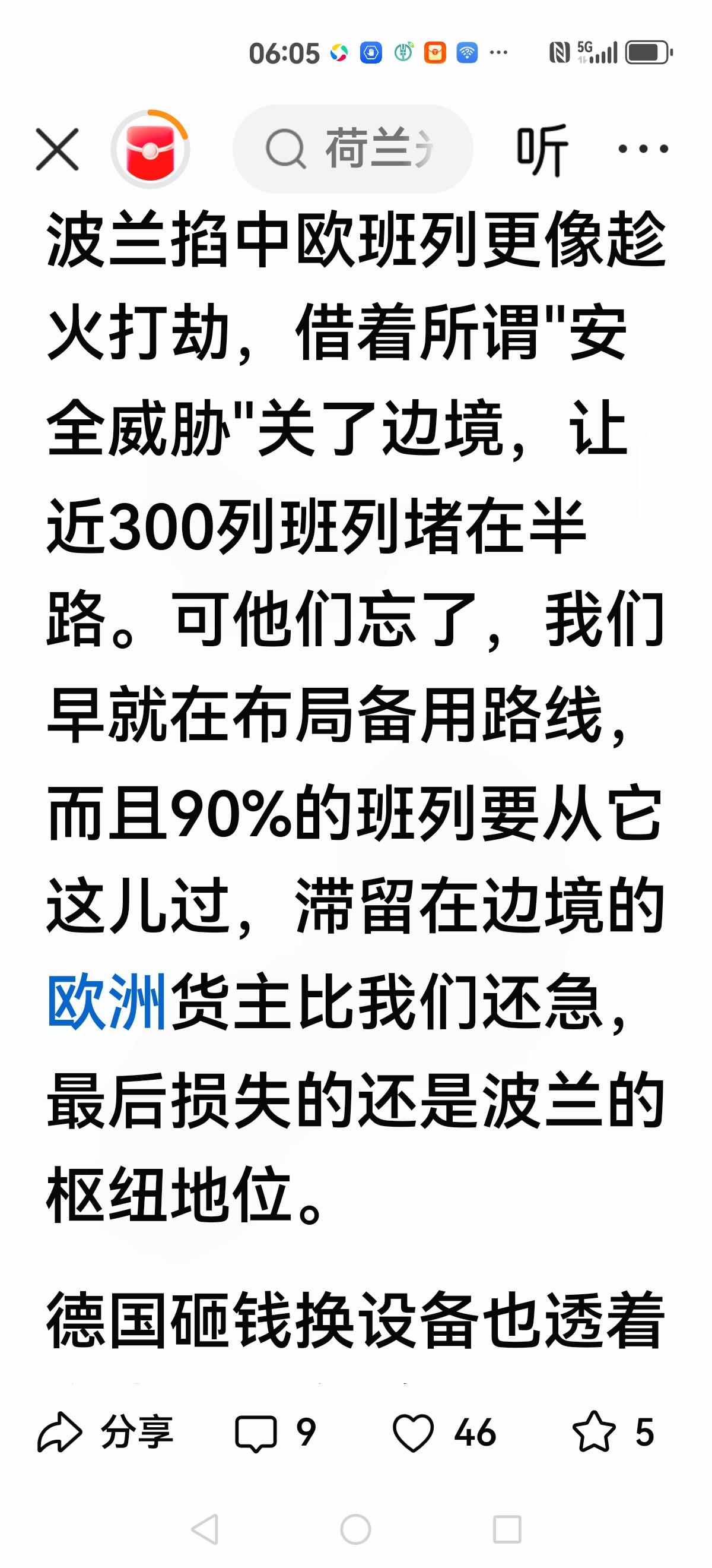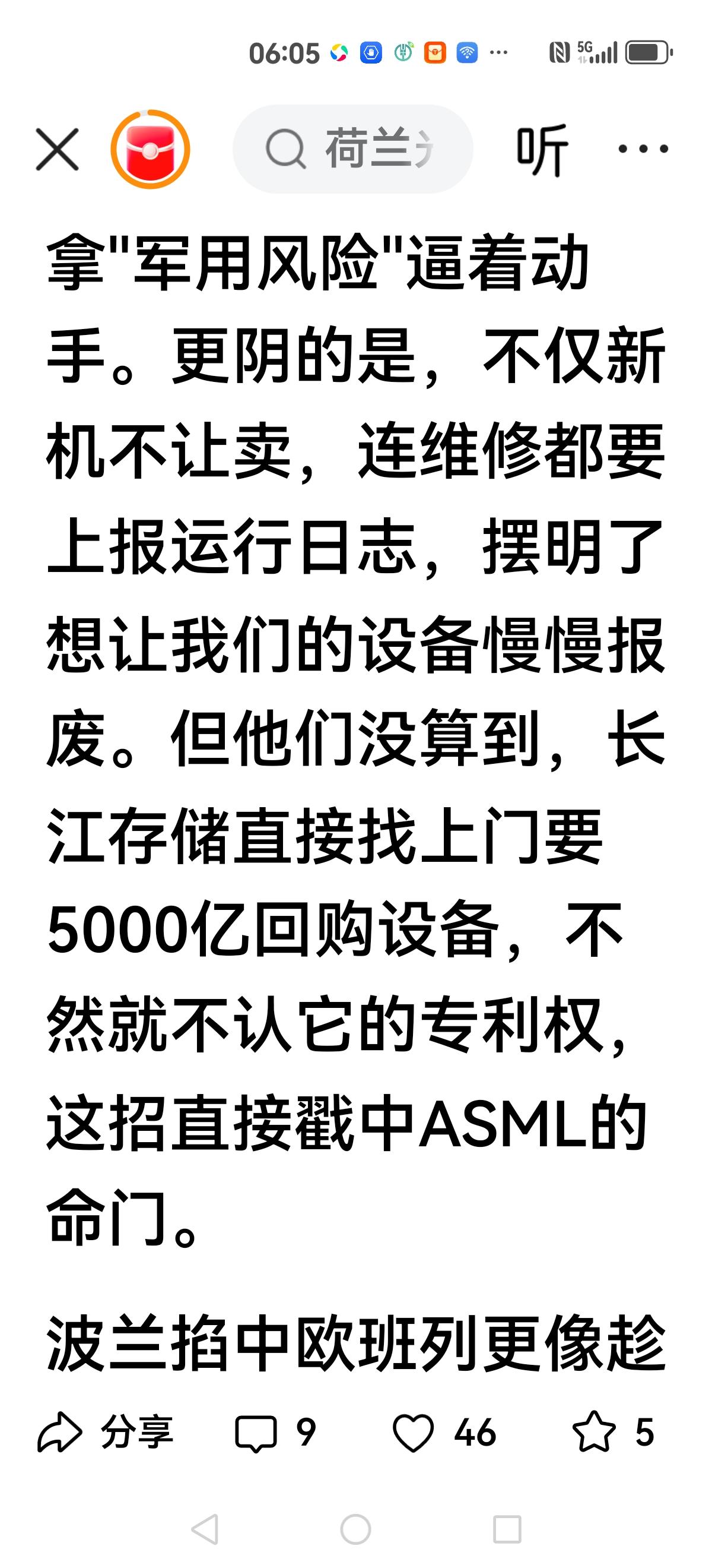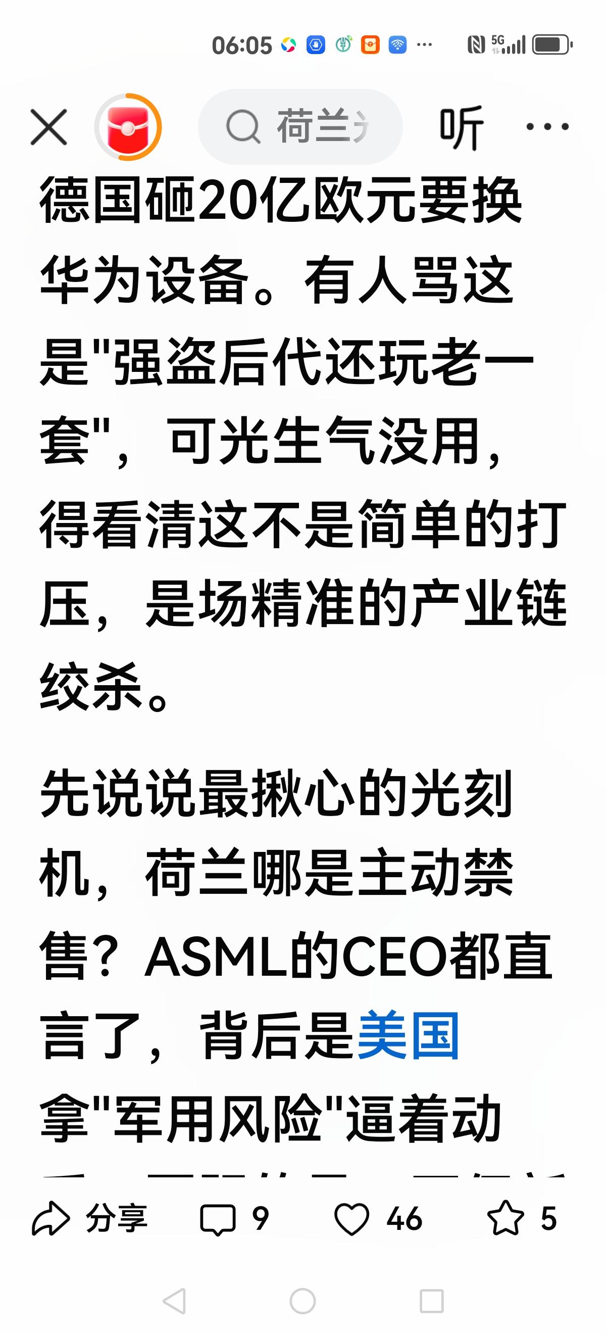 【荷兰没有服软】 荷兰没有服软,还强硬禁止出口我们的光刻机。 德国业转向用20亿资金取代华为与中兴所有设备。 前不久波兰卡住中欧班列,就是不放行。 闻泰科技的荷兰安世,其实负责生产芯片,而封装在国内,我们禁止发货出口到德国的芯片。 本想用这招导致荷兰改变态度,可现在看荷兰没有服软。 德国也奇怪,竟然启动20亿替代华为中兴设备。 有人分析荷兰是在美国强大军事上被逼无奈。 请教一下张,沈,金,高,该怎么办?我们的军事更强荷兰不怕吗? 张说过:他们卡什么,我们突破什么?看来荷兰卡我们光刻机,我们难道没突破? 这次荷兰没有服软,说明我们没卡住对方,到底谁离不开谁? 难道真的失去欧洲吗?