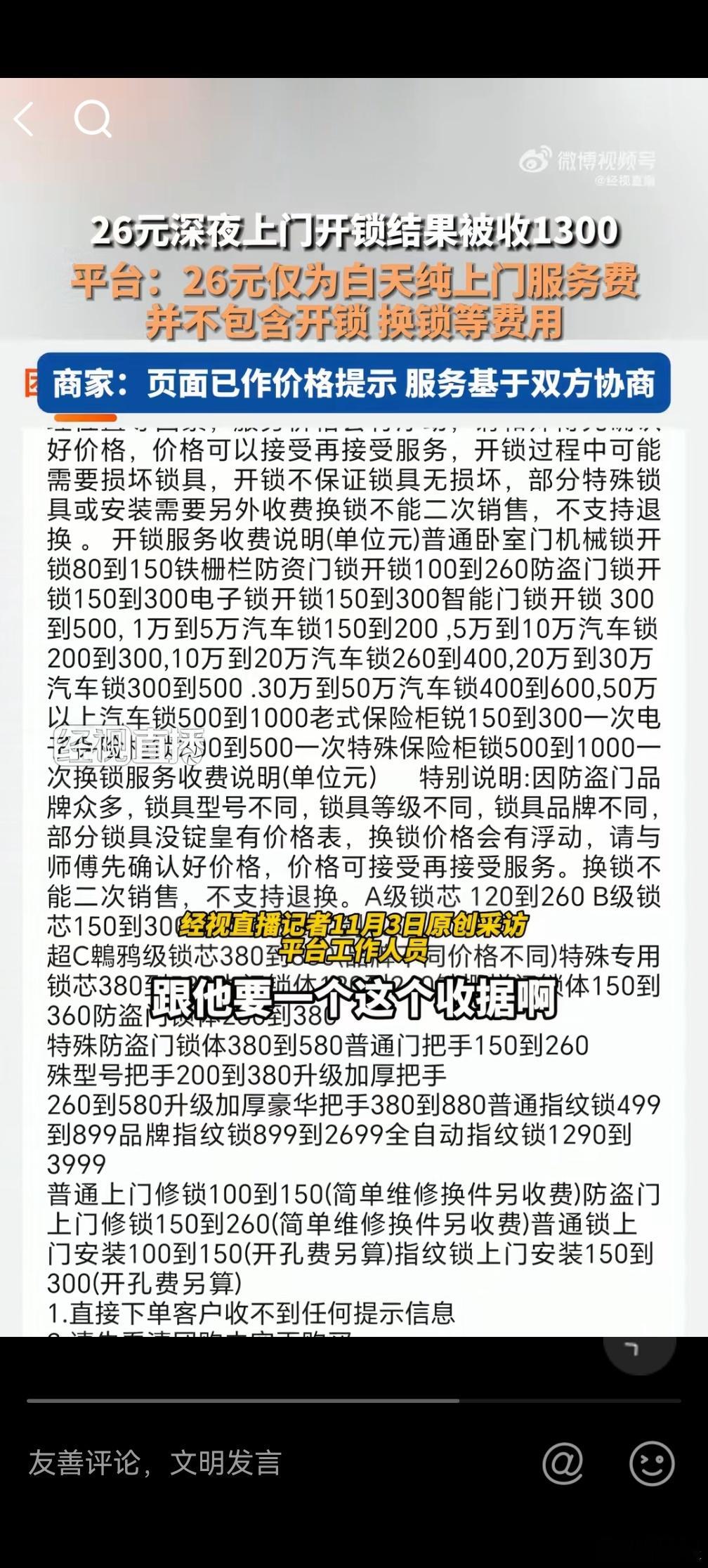 商家回应26元上门开锁最终收费1300这意思是26块钱只是平台服务费?相当于在平台找个开锁师傅要先花26块钱 ,找到后师傅上门开锁万另收费。