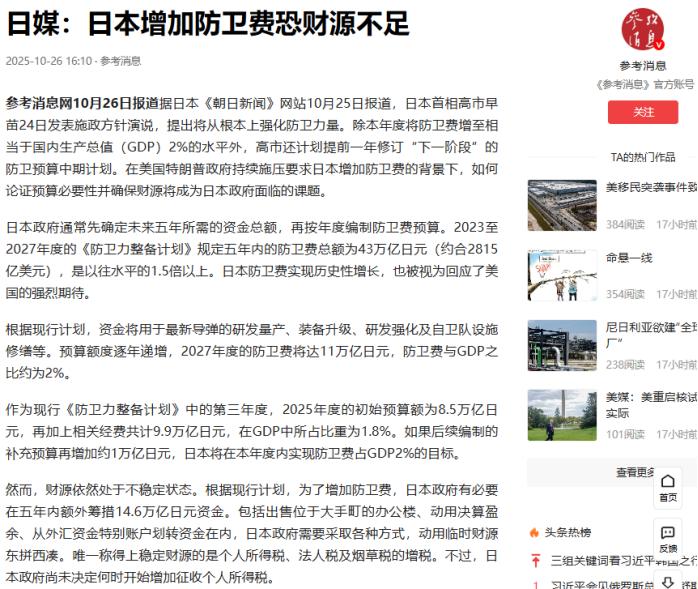 中日会晤结束后,日本首相高市早苗10月31日晚写道:我与中方会面,强调了直接坦诚对话的重要性,正是因为存在一些共同关心的问题和意见分歧。中方表达了各种关切,并探讨了合作的可能性。我打算继续与中方就日本国民安全和地区和平进行深入对话。 这位日本第一位女首相,嘴上说得软,手上的动作可一点不温柔。在10月24日的施政演说里,她把原定于2027年达成的“防卫费占GDP2%”目标强行提前到本年度,甚至放话要研究进一步上调,目标直逼美国暗示的3.5%。 她口中“为了国民安全”的算盘,藏在一串惊人的数字里:敲定的2023至2027年度防卫预算总额达到43万亿日元,是以往五年的1.5倍还多,折合成美元足足2815亿。 2025年度初始预算就有8.5万亿日元,加上各类补充经费已冲到9.9万亿,占GDP比重1.8%,再补1万亿就能达标2%,这波操作把“急着扩军”写得明明白白。 为了凑齐这笔钱,高市内阁已经在盘算加税的主意,企业所得税、个人所得税甚至烟草税都被拉上清单,这份“慷慨”背后全是普通日本民众的钱包在买单。 要知道日本政府原本计划靠出售办公楼、动用决算盈余这些临时手段凑齐14.6万亿额外财源,如今动起税的念头,足见扩军决心有多迫切,毕竟2027年单年度11万亿日元的预算目标摆在那,不掏真金白银根本撑不住。 军事上,她刚上任没几天就急着跟美国绑在一起,铁了心要搞军事加码。不仅从美国买了400枚“战斧”巡航导弹,花了23.5亿美元,还催着美方提前到2025年交货,就是想快点拿到能打远距离目标的利器。 当然了,军事动作远不止买导弹这么简单。高市早苗在施政演说里明确要求推进新型潜艇建设,目标是能搭载远程导弹且实现长期潜航,这种装备早已脱离“自卫”范畴。 更值得琢磨的是,她还计划在2026年底前全面修订“安保三文件”,这套顶层防卫纲领在2022年修订时就已让日本获得“反击能力”,从防御转向进攻,如今再改,无疑是要彻底撕碎“专守防卫”的最后一层遮羞布。 跟美国的捆绑更是紧锣密鼓。10月28日,也就是中日会晤前三天,高市早苗特意陪着特朗普登上横须贺基地的“乔治·华盛顿”号航母。 在六千名美军官兵面前,特朗普直言不讳夸她是“赢家”,她则当场宣布要强化稀土供应链合作,还要继承安倍晋三的路线推进“自由开放的印太”。 这场高调互动里,特朗普当场批准向日本交付F-35战斗机配套导弹,算是给这位“听话的小弟”送上定心丸。美日还趁势签了关税协定和对美投资方案,本质就是用日本的钱袋子换美国对其军事松绑的默许。 这种表里不一早有端倪。高市早苗从踏入政坛起就主张修改和平宪法,要把自卫队改名“国防军”,2021年还跟着安倍晋三参拜靖国神社。 上任后中日关系罕见“冷启动”,她就职一周双方都没互发贺电,却在施政演说里暗指“地区国家单方面改变现状”,结合她此前反复提及“台海和平与地区相关”的言论,矛头指向再清晰不过。 嘴上喊着“深入对话”,实际却在加速军事扩张、搭建对华包围圈。43万亿日元的预算、提前落地的防卫费目标、不断升级的武器装备,还有跟美国愈发紧密的军事绑定,每一步都在给地区和平添堵。 日本国内舆论已经担忧这种路线会把国家拖入军备竞赛,《朝日新闻》更是直斥其“强烈鹰派色彩”,但高市早苗显然没打算停下脚步,毕竟在她的算盘里,靠美国撑腰实现军事松绑,比真的坐下来谈和平要迫切得多。
