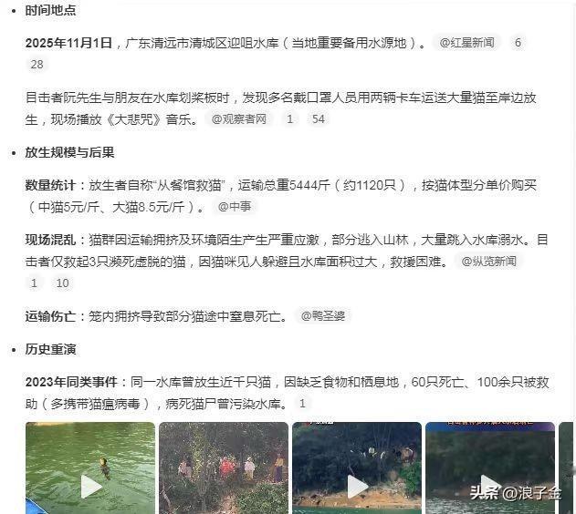 重要水源地放生几千只猫!现场当大悲咒!水库被严重污染!这到底是放生还是虐杀! 11月1日,广东清远市清城区迎咀水库,为本地一级主水源地, 一群戴口罩的“大善人“用两辆卡车运送几千只猫至岸边放生,为了烘托气氛,在现场播放《大悲咒》! 据说放生者自称这些猫是“从餐馆救的猫”,运输总重5444斤(约1120只) ,按猫体型分单价购买(中猫5元斤、大猫8.5元斤)! 现场混乱且残忍!有部分猫逃入山林,还有大量猫跳入水库溺水。目击者仅救起3只濒死虚脱的猫,这哪里是放生,是虐杀!而且污染了水源地! 无独有偶!2023年同类事件:同一个水库也曾放生近千只猫,因缺乏食物和栖息地, 60只死亡、100余只被救助! 估计现场的猫的冤魂还没消散吧,那些大善人的心不会痛吗?大悲咒能否消除你们的罪恶?
