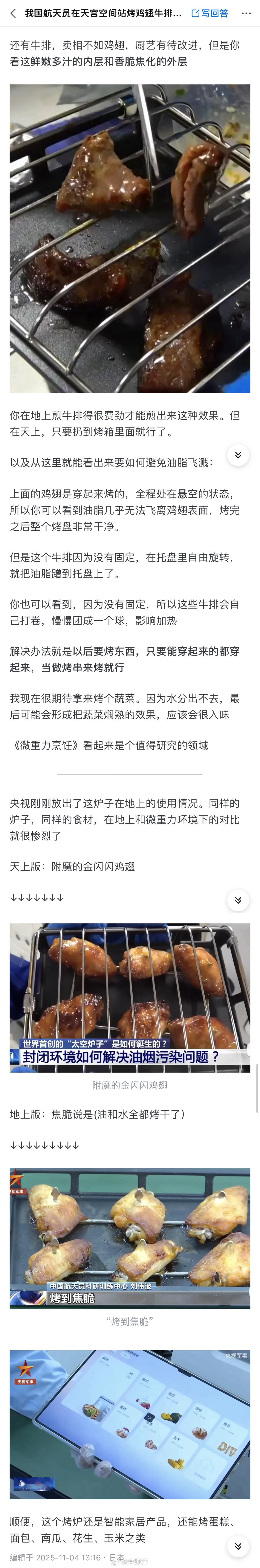 太空烤翅出炉航天员直呼哇塞这样看来,太空烤翅还存在至少一项重大缺陷:我吃不到😭