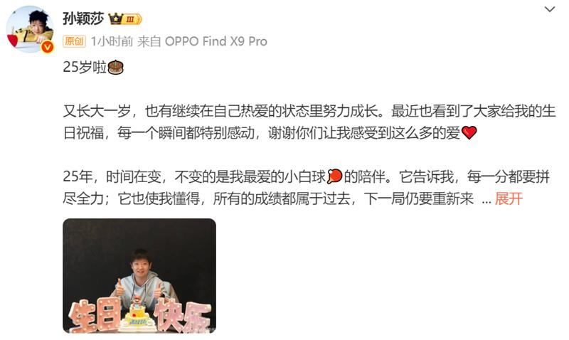 25岁生日,莎莎的发文很用心,很感人! 11月4日,莎莎迎来自己25岁生日,她在微博发了一段很长、很用心、也很感人的话,内容大致可以总结为以下3点: 1、25岁,祝自己生日快乐,也非常感谢所有人的生日祝福。 2、25年,时间在变,但对乒乓的热爱不减,成绩已是过去,未来重新出发。 3、新的一岁,新的开始,希望自己简单快乐、全力以赴,也希望所有支持自己的人一起努力,努力成为更好的自己。 莎莎全程都说得很真挚,很走心,也发了自己的生日蛋糕图,虽然匆忙,恰好赶在出发澳门参加全运的时间点上,但该有的仪式感还是有了,让我们一起祝莎莎生日快乐! 此次的第十五届全运会,是莎莎的第3次全运之旅,之前的女单最好成绩是亚军,自女团亚锦赛夺冠后,莎莎就此开启了封闭训练,没再参加任何比赛,自然就是为了向冠军发起最有力冲击。 新的一岁,新的开始,希望莎莎借助生日的祝福,在全运赛场上能有好的发挥,加油!