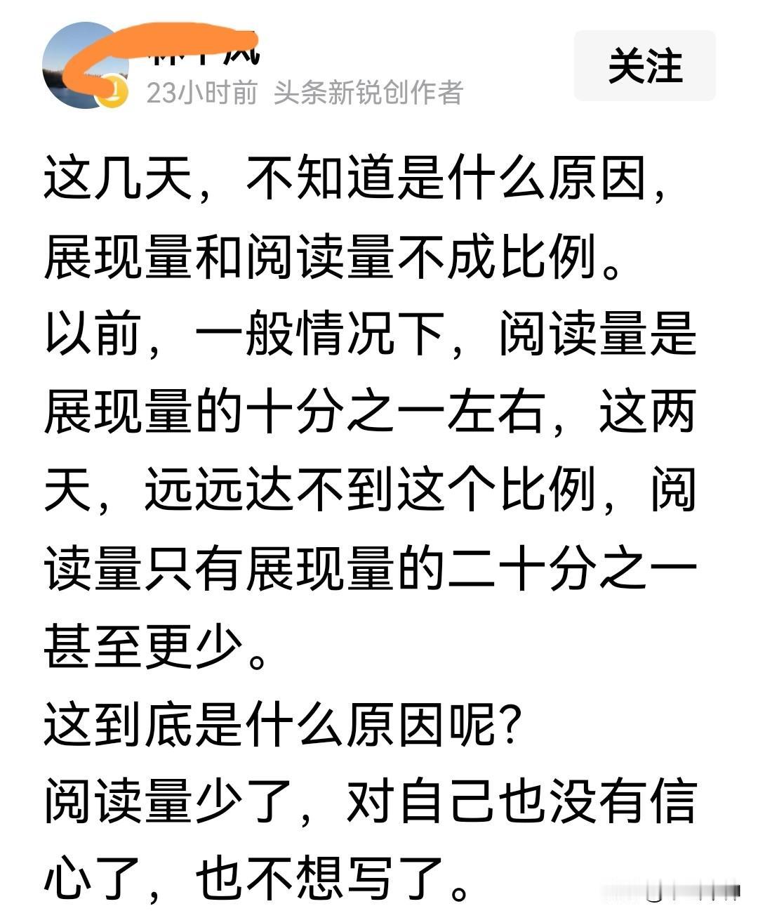 全网都懵了,为什么近几天今日头条阅读量呈断崖式下跌? 一位网友说,以前一般情况下阅读量是展现量的1/10左右,这两天远远达不到这个比例,阅读量只有展现量的1/20甚至更少。 因为天天写,我也明显感到了这种变化,我思来想去,估计可能因为两点: 第一,头条上的创作者越来越多,僧多粥少,平台必须控制流量,节省支出。 第二,头条搞了新锐作者限时发文赢66元奖金活动,一周阅读量超1万就奖励66元。如果不严控阅读量,大面积获奖可能平台承受不了! 当然,这是我的猜测,准不准不好说,反正近几天在头条发文阅读量太难上去了。