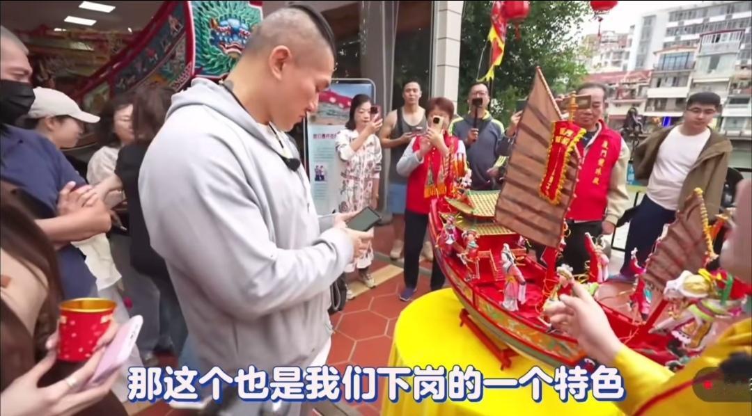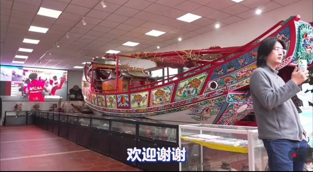 11月4日,台湾网红馆长陈之汉抵达厦门沙坡尾进行参观,有一位穿着上衣是黄色传统服饰的小姐姐当导游,主要了解了“送王船文化”。 馆长首先参观了厦港海洋文化展示厅,这里陈列着非遗产品凤凰船,有一一艘“王船”模型摆在大厅,讲解员给网红馆长详细介绍了王船。 厦门和台湾南部一些地方有送王船的文化,主要是为出海捕捞的渔船祈求平安,这一民间文化现在依然保留着。