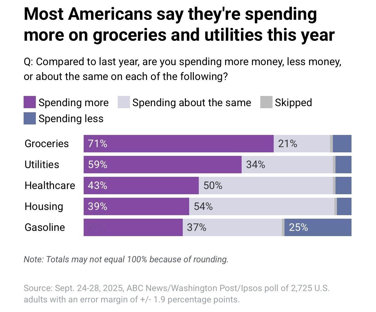 根据ABC新闻、华盛顿邮报与益普索通过其KnowledgePanel联合进行的民调显示,大多数美国人表示他们在食品杂货和公共事业费用上的支出增加,同时认为关税会加剧通胀、损害经济,并影响到自己的财务状况。