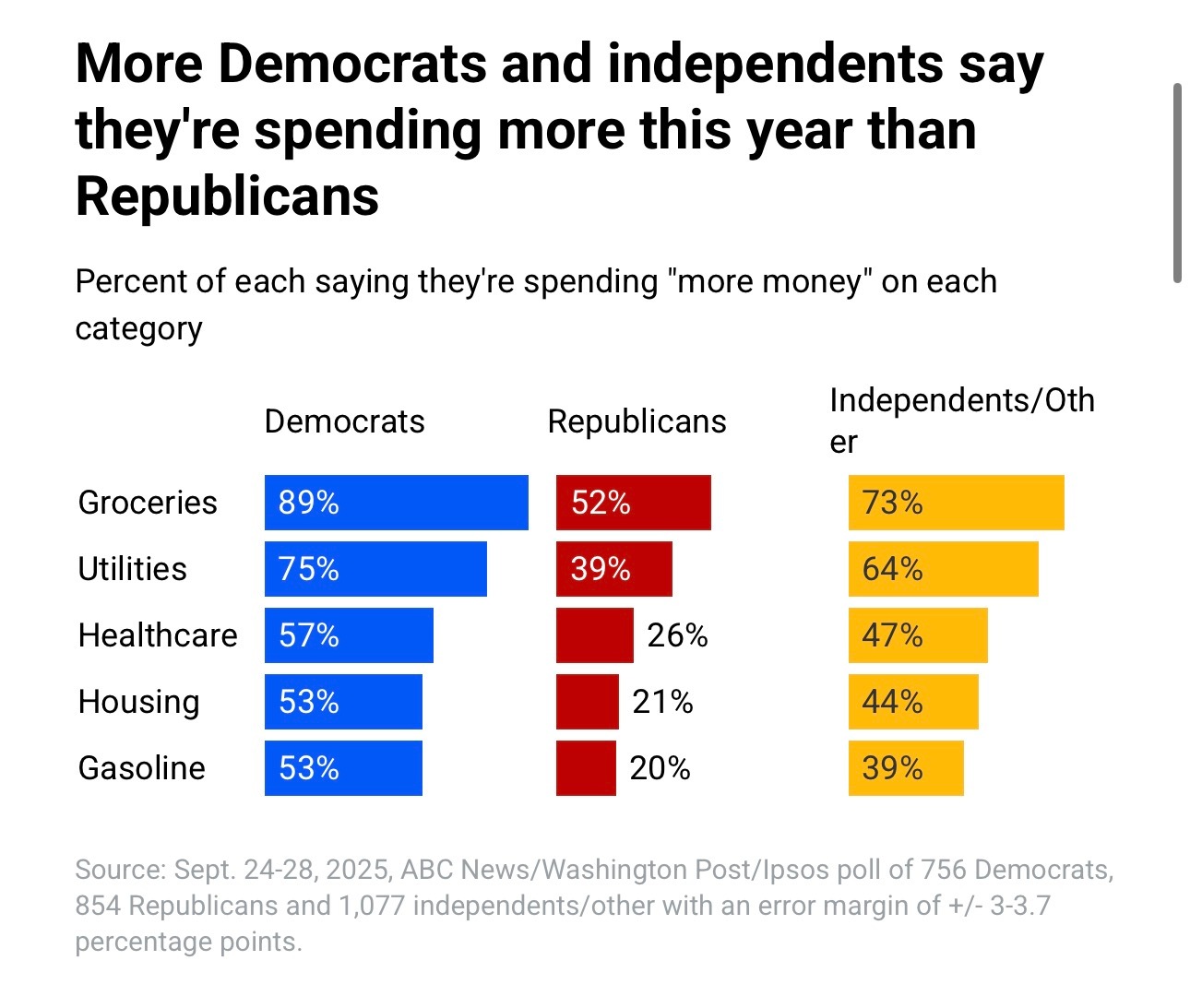 这项由ABC新闻、华盛顿邮报与益普索联合开展的民调,于2025年10月24日至28日在线进行,调查对象为2725名美国成年人,覆盖英语和西班牙语人群,抽样具有随机性。误差范围为正负1.9个百分点,具体分组的误差可能更大。受访者中,民主党占28%,共和党占31%,独立人士或其他身份占41%。